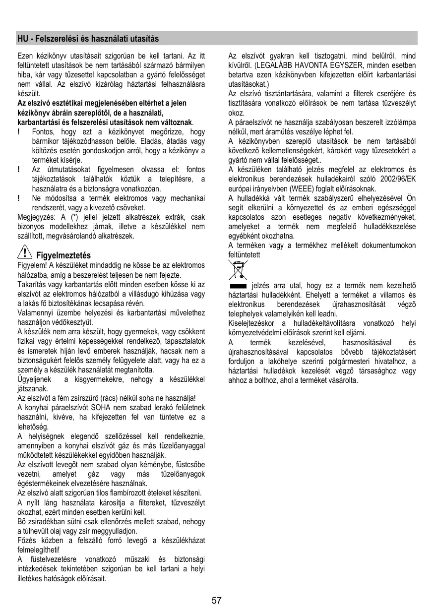 Az elszívót gyakran kell tisztogatni, mind belülről, mind kívülről. (LEGALÁBB HAVONTA EGYSZER, minden esetben betartva ezen kézikönyvben kifejezetten előírt karbantartási utasításokat.) Az elszívó tisztántartására, valamint a filterek cseréjére és tisztítására vonatkozó előírások be nem tartása tűzveszélyt okoz. A páraelszívót ne használja szabályosan beszerelt izzólámpa nélkül, mert áramütés veszélye léphet fel. A kézikönyvben szereplő utasítások be nem tartásából következő kellemetlenségekért, károkért vagy tűzesetekért a gyártó nem vállal felelősséget.. A készüléken található jelzés megfelel az elektromos és elektronikus berendezések hulladékairól szóló 2002/96/EK európai irányelvben (WEEE) foglalt előírásoknak. A hulladékká vált termék szabályszerű elhelyezésével Ön segít elkerülni a környezettel és az emberi egészséggel kapcsolatos azon esetleges negatív következményeket, amelyeket a termék nem megfelelő hulladékkezelése egyébként okozhatna. A terméken vagy a termékhez mellékelt dokumentumokon feltüntetett