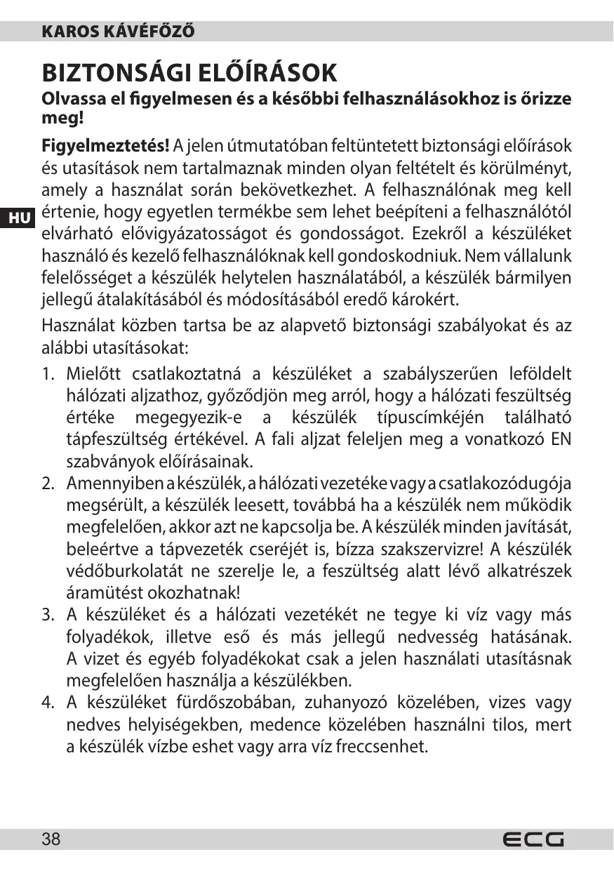 - Az ECG nem vällal felelosséget a keszülék helytelen használatábl vagy figyelmetlenségból eredó serulésekér és károkér. A keszülék használatba vetele elött gondosan olvassa el a használati utmutató minded fejezetét. A keszülék külso felülete a használat során erösen felmelegszik, a megérintese égési seruléseket okozhat. A muködő keszüléket ne hagyja felügyelet nélkül (fǒleg, ha a bözelben gyerekek is tartózkodnak).