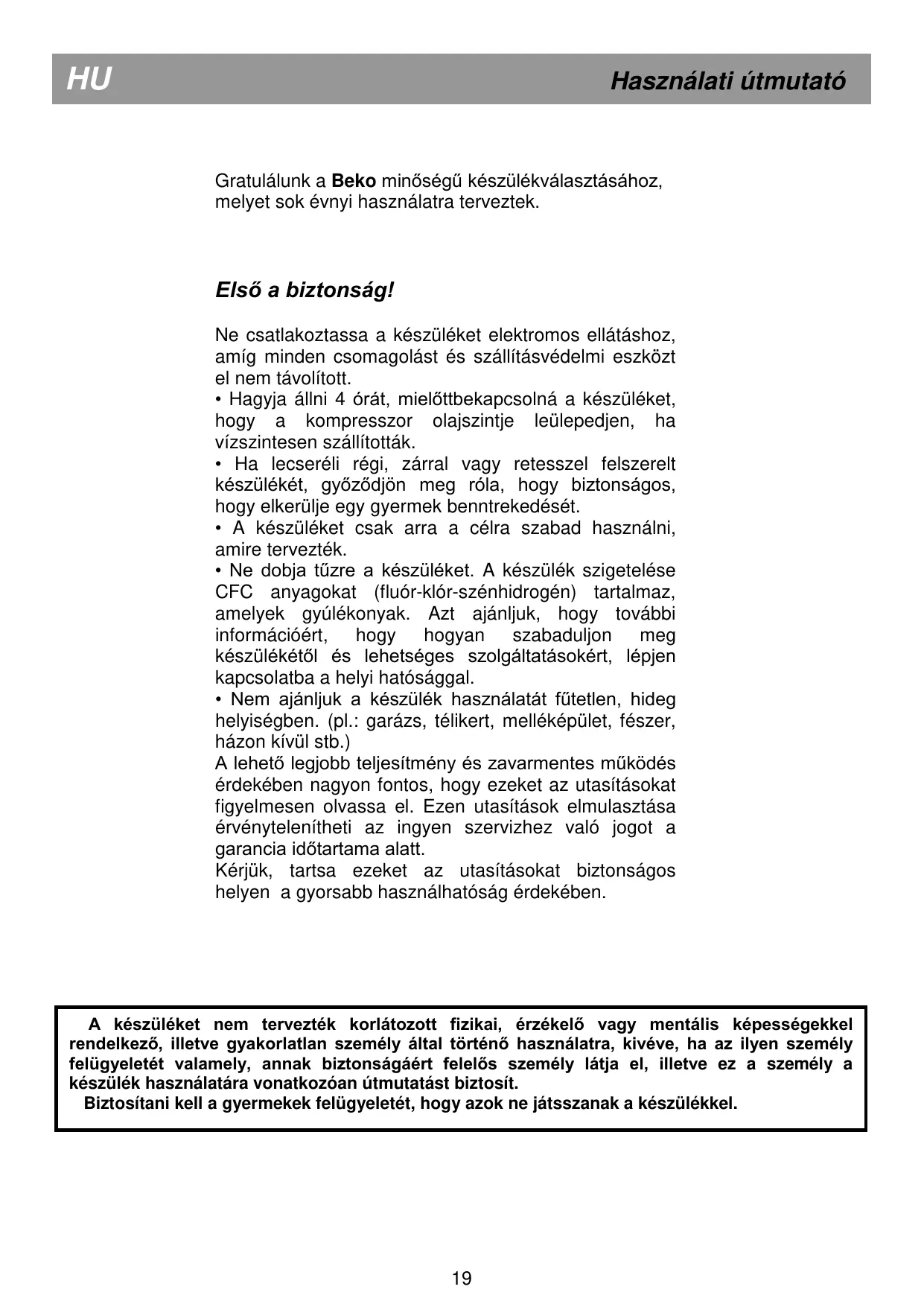 Első a biztonság! Ne csatlakoztassa a készüléket elektromos ellátáshoz, amíg minden csomagolást és szállításvédelmi eszközt el nem távolított. • Hagyja állni 4 órát, mielőttbekapcsolná a készüléket, hogy a kompresszor olajszintje leülepedjen, ha vízszintesen szállították. • Ha lecseréli régi, zárral vagy retesszel felszerelt készülékét, győződjön meg róla, hogy biztonságos, hogy elkerülje egy gyermek benntrekedését. • A készüléket csak arra a célra szabad használni, amire tervezték. • Ne dobja tűzre a készüléket. A készülék szigetelése CFC anyagokat (fluór-klór-szénhidrogén) tartalmaz, amelyek gyúlékonyak. Azt ajánljuk, hogy további információért, hogy hogyan szabaduljon meg készülékétől és lehetséges szolgáltatásokért, lépjen kapcsolatba a helyi hatósággal. • Nem ajánljuk a készülék használatát fűtetlen, hideg helyiségben. (pl.: garázs, télikert, melléképület, fészer, házon kívül stb.) A lehető legjobb teljesítmény és zavarmentes működés érdekében nagyon fontos, hogy ezeket az utasításokat figyelmesen olvassa el. Ezen utasítások elmulasztása érvénytelenítheti az ingyen szervizhez való jogot a garancia időtartama alatt. Kérjük, tartsa ezeket az utasításokat biztonságos helyen a gyorsabb használhatóság érdekében.