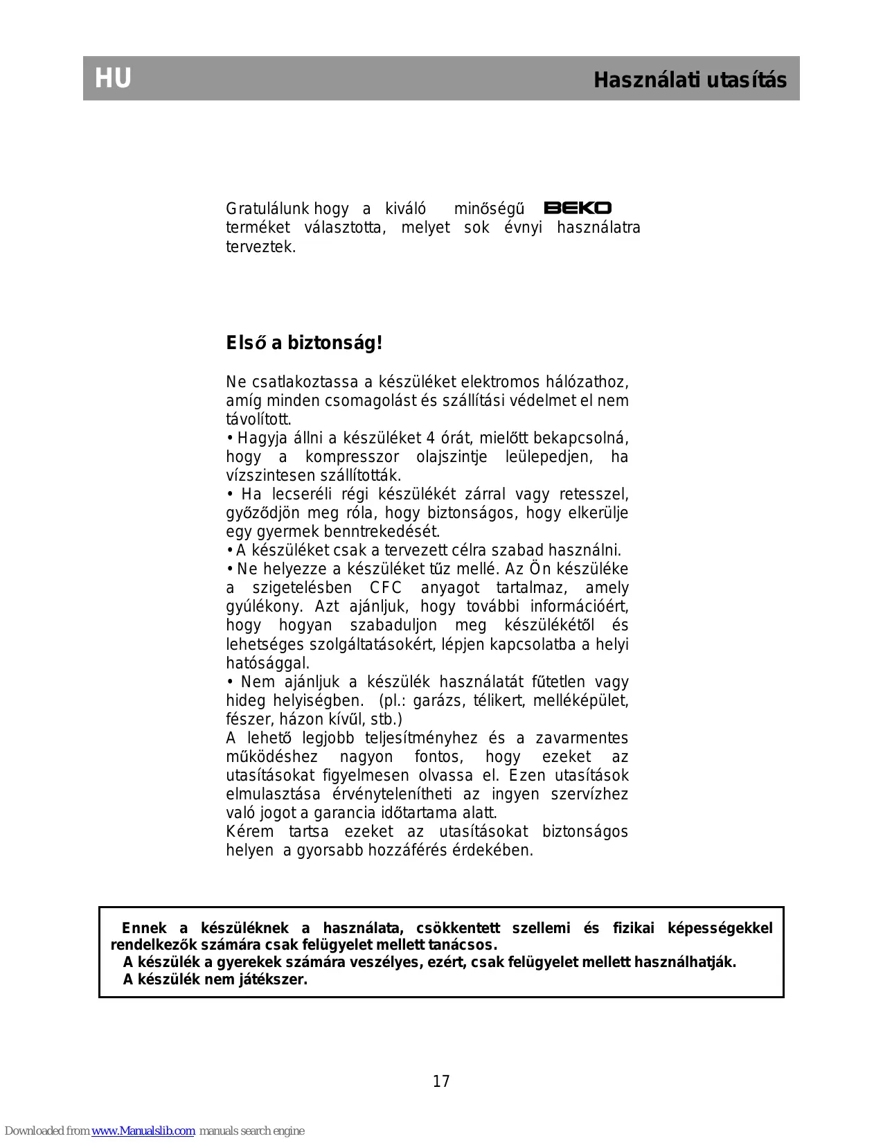 Elsı a biztonság! Ne csatlakoztassa a készüléket elektromos hálózathoz, amíg minden csomagolást és szállítási védelmet el nem távolított. • Hagyja állni a készüléket 4 órát, mielıtt bekapcsolná, hogy a kompresszor olajszintje leülepedjen, ha vízszintesen szállították. • Ha lecseréli régi készülékét zárral vagy retesszel, gyızıdjön meg róla, hogy biztonságos, hogy elkerülje egy gyermek benntrekedését. • A készüléket csak a tervezett célra szabad használni. • Ne helyezze a készüléket tőz mellé. Az Ön készüléke a szigetelésben CFC anyagot tartalmaz, amely gyúlékony. Azt ajánljuk, hogy további információért, hogy hogyan szabaduljon meg készülékétıl és lehetséges szolgáltatásokért, lépjen kapcsolatba a helyi hatósággal. • Nem ajánljuk a készülék használatát főtetlen vagy hideg helyiségben. (pl.: garázs, télikert, melléképület, fészer, házon kívől, stb.) A lehetı legjobb teljesítményhez és a zavarmentes mőködéshez nagyon fontos, hogy ezeket az utasításokat figyelmesen olvassa el. Ezen utasítások elmulasztása érvénytelenítheti az ingyen szervízhez való jogot a garancia idıtartama alatt. Kérem tartsa ezeket az utasításokat biztonságos helyen a gyorsabb hozzáférés érdekében.