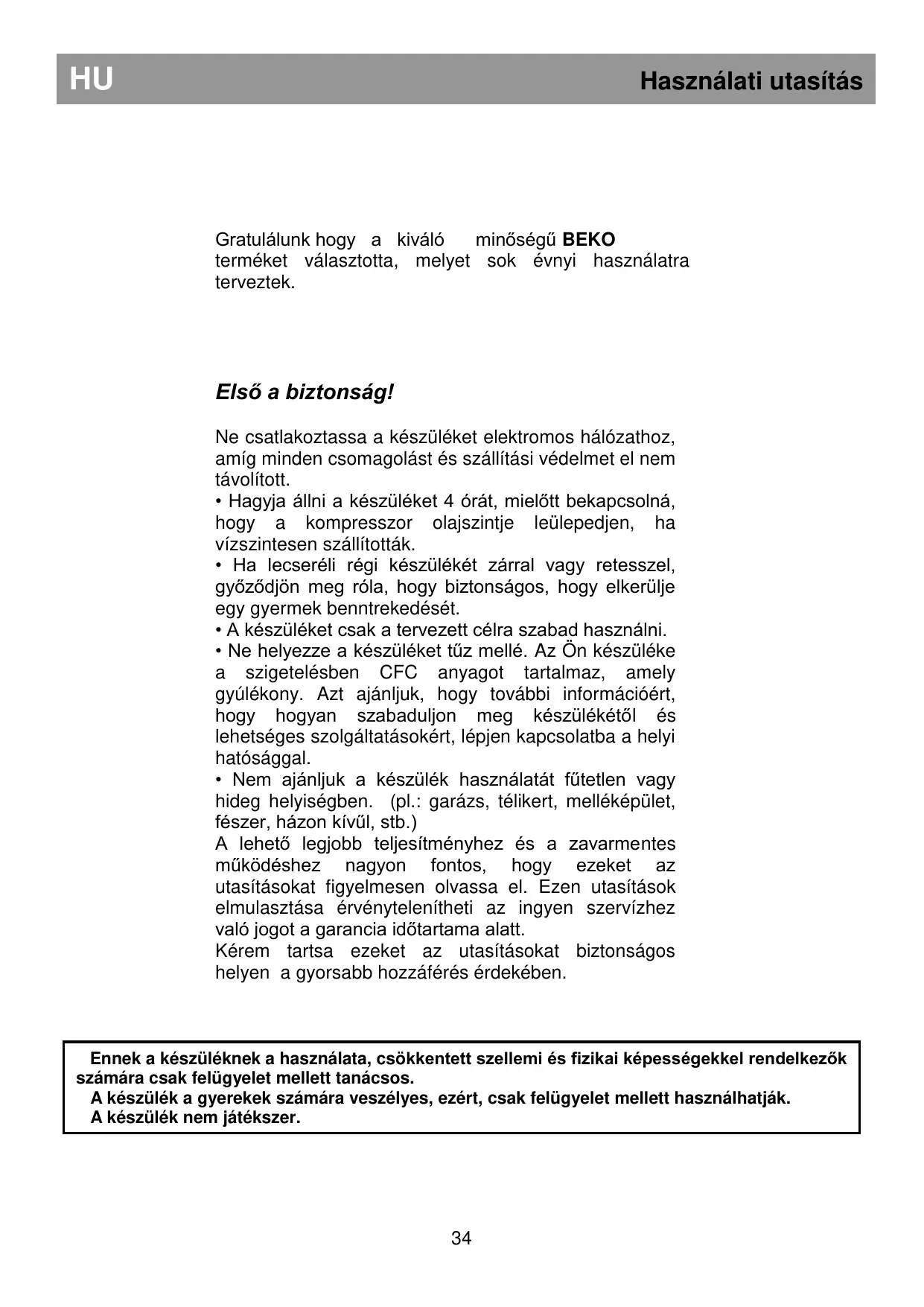 Ennek a keszüléknek a használata, csökkentett szellemi és fizikai képességekkel rendelkezők számáraCsak felügyelet mellett tanácsos.