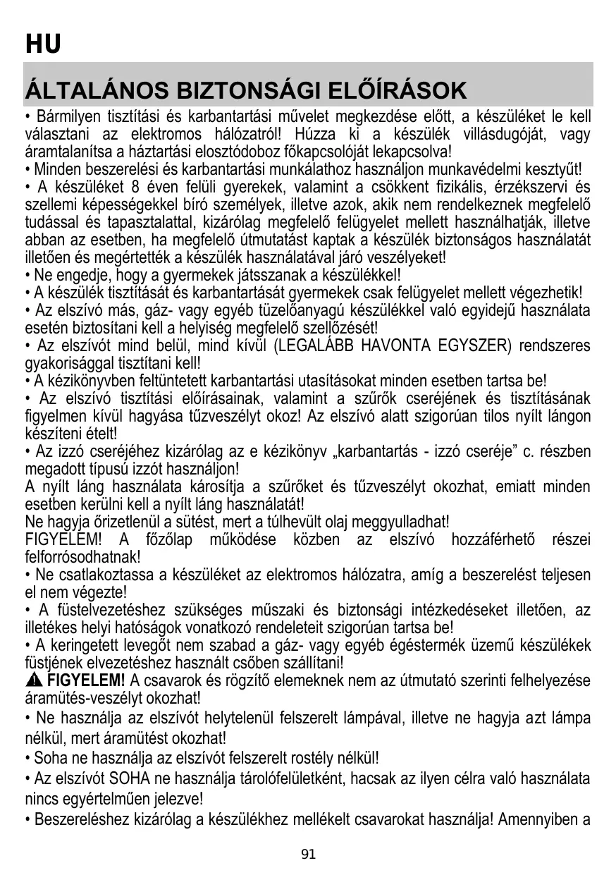 • Les enfants ne doivent pas jouer avec l’appareil. • Le nettoyage et l’entretien par l’usager ne doivent pas être effectués par des enfants sans surveillance. • La pièce doit avoir une aération suffisante lorsque la hotte est utilisée conjointement avec d'autres appareils fonctionnant au gaz ou autres combustibles. • La hotte doit être régulièrement nettoyée à la fois à l'intérieur et à l'extérieur (AU MOINS UNE FOIS PAR MOIS); cela devrait se faire en conformité avec les instructions d'entretien. Le non respect des instructions expressément fournies concernant le nettoyage de la hotte et des filtres peut provoquer des risques d'incendie. • Ne pas flamber d’aliments sous la hotte. • Pour le remplacement de la lampe, utilisez uniquement le type de lampe spécifié dans la section remplacement/maintenance lampe dans ce manuel. L'utilisation d'une flamme nue est dommageable pour les filtres et peut causer un incendie, par conséquent, il est déconseillé de l'utiliser. La friture doit être faite avec soin afin de s’assurer que l’huile surchauffée ne prenne pas feu. AVERTISSEMENT: Lorsque la table de cuisson est en fonctionnement, les parties accessibles de la hotte peuvent devenir très chaudes. • Ne pas brancher l'appareil au réseau électrique avant que l'installation ne soit complètement terminée. • En ce qui concerne les mesures techniques et de sécurité à prendre pour l'évacuation des fumées, respectez strictement les dispositions des règlements locales. • L’air ne doit pas être envoyé dans un conduit utilisé pour évacuer les fumées d’appareils utilisant du gaz ou un autre combustible. ATTENTION ! Le défaut d'installer les vis et les dispositifs de fixation conformément à ces instructions peut entraîner des risques électriques. • Ne pas utiliser ou laisser la hotte sans les lampes correctement montées, car un éventuel risque de choc électrique est possible. • N’utilisez jamais la hotte sans la grille montée correctement! • La hotte ne doit JAMAIS être utilisée comme une surface d'appui, sauf indication expresse. 21