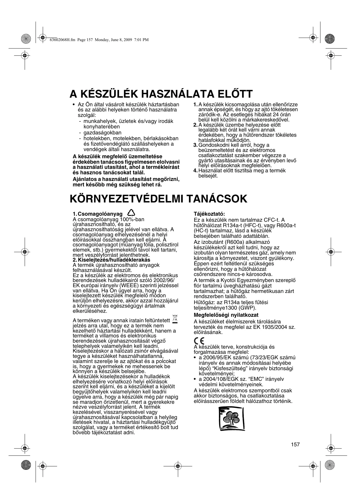 V7 G3602068H.fm Page 156 Monday, June 8, 2009 7:01 PM HASZNAÂLATI UTASITAS A KÉSZÜLÉK HASZNÂLATA ELÔTT KÔRNYEZETVÉDELMI TANÂCSOK