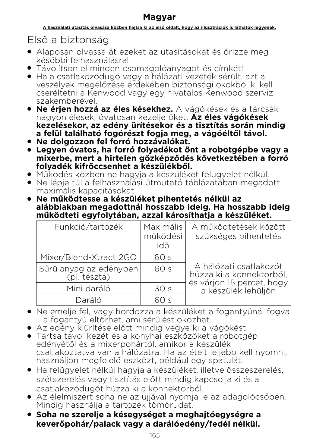 Weegfunctie O Si le cordon ou la prise sont endommagés, il faut les faire remplacer, pour des raisons de sécurité, par Kenwood ou un réparateur agréé par Kenwood pour éviter tout accident. O NE TOUCHEZ PAS les lames, elles sont tranchantes. Les lames et les disques sont très tranchants, manipulez-les avec précaution. Tenez toujours les ustensiles et accessoires par la partie supérieure, loin des zones coupantes, lorsque vous les manipulez, que vous videz le bol ou pendant le nettoyage. O Veuillez NE PAS MIXER des ingrédients chauds. O Soyez prudent lorsque vous versez des liquides chauds dans le bol du robot ou du blender, la production soudaine de vapeur entraine un risque de projections. O Ne laissez jamais l’appareil sans surveillance lorsqu’il fonctionne. O Ne dépassez pas les capacités maximales données dans le tableau des conseils d’utilisation. O N’utilisez pas votre appareil pendant plus de temps que celui spécifié ci-dessous sans période d’arrêt. Si vous l'utilisez pendant de plus longues périodes, vous risquez d'endommager l'appareil. Fonction/accessoire Temps Temps d’arrêt entre d’utilisation les utilisations maximal Blender/Blend-Xtract 2GO O Veillez toujours à retirer la lame avant de verser le contenu du bol. O Conservez les mains et tout ustensile hors du bol du robot ou du blender lorsque l’appareil est branché sur l’alimentation électrique. Si vous devez pousser des aliments, utilisez un ustensile approprié tel qu'une spatule. O Éteignez toujours l'appareil et débranchez-le de l'alimentation lorsque vous devez le laisser sans surveillance et avant d'installer de retirer, ou de nettoyer les accessoires. O