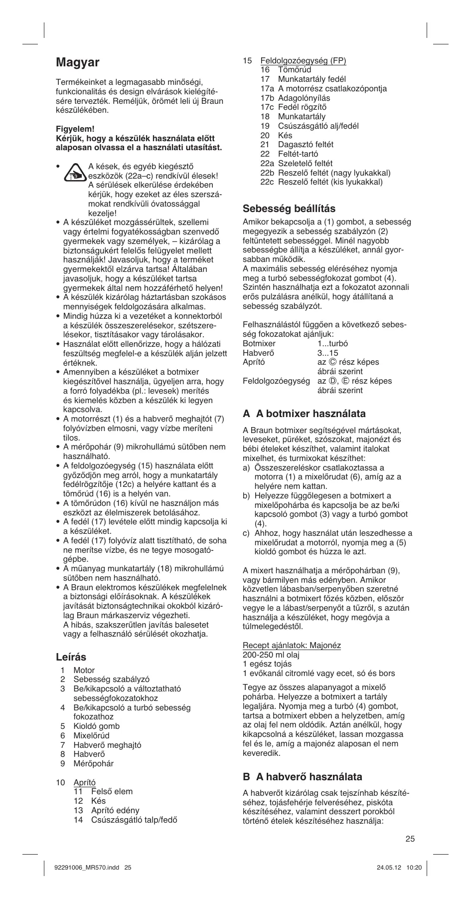 A A botmixer használata A Braun botmixer segítségével mártásokat, leveseket, püréket, szószokat, majonézt és bébi ételeket készíthet, valamint italokat mixelhet, és turmixokat készíthet: a) Összeszereléskor csatlakoztassa a motorra (1) a mixelőrudat (6), amíg az a helyére nem kattan. b) Helyezze függőlegesen a botmixert a mixelőpohárba és kapcsolja be az be/ki kapcsoló gombot (3) vagy a turbó gombot (4). c) Ahhoz, hogy használat után leszedhesse a mixelőrudat a motorról, nyomja meg a (5) kioldó gombot és húzza le azt. A mixert használhatja a mérőpohárban (9), vagy bármilyen más edényben. Amikor közvetlen lábasban/serpenyőben szeretné használni a botmixert főzés közben, először vegye le a lábast/serpenyőt a tűzről, s azután használja a készüléket, hogy megóvja a túlmelegedéstől. Recept ajánlatok: Majonéz 200-250 ml olaj 1 egész tojás 1 evőkanál citromlé vagy ecet, só és bors Tegye az összes alapanyagot a mixelő pohárba. Helyezze a botmixert a tartály legaljára. Nyomja meg a turbó (4) gombot, tartsa a botmixert ebben a helyzetben, amíg az olaj fel nem oldódik. Aztán anélkül, hogy kikapcsolná a készüléket, lassan mozgassa fel és le, amíg a majonéz alaposan el nem keveredik.