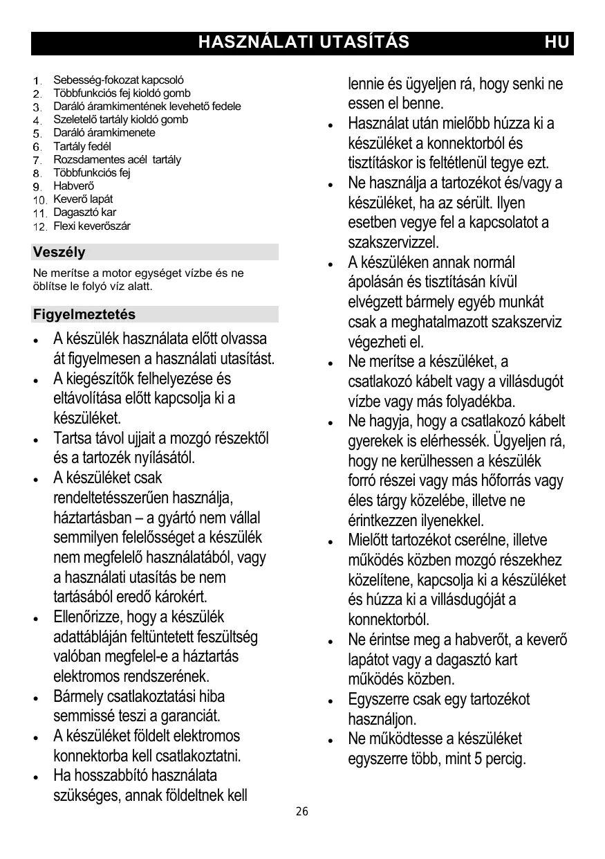 Obturateur amovible pour la prise de courant du hachoir Bouton de déverrouillage du couteau Prise de courant pour le hachoir Couvercle du bol Bol en acier inoxydable Tête multifonction Fouet Crochet pétrisseur éléments mobiles et des orifices destinés à l'insertion des accessoires. Utilisez l'appareil uniquement pour l'usage ménager auquel il est destiné. Le fabricant déclinera toute responsabilité si l'appareil fait l'objet d'une utilisation inappropriée ou si les présentes instructions ne sont pas respectées. Vérifiez que la tension nominale de votre appareil correspond bien à celle de votre réseau électrique. Toute erreur de raccordement annulera la garantie. L'appareil doit être branché à une prise raccordée à la terre.