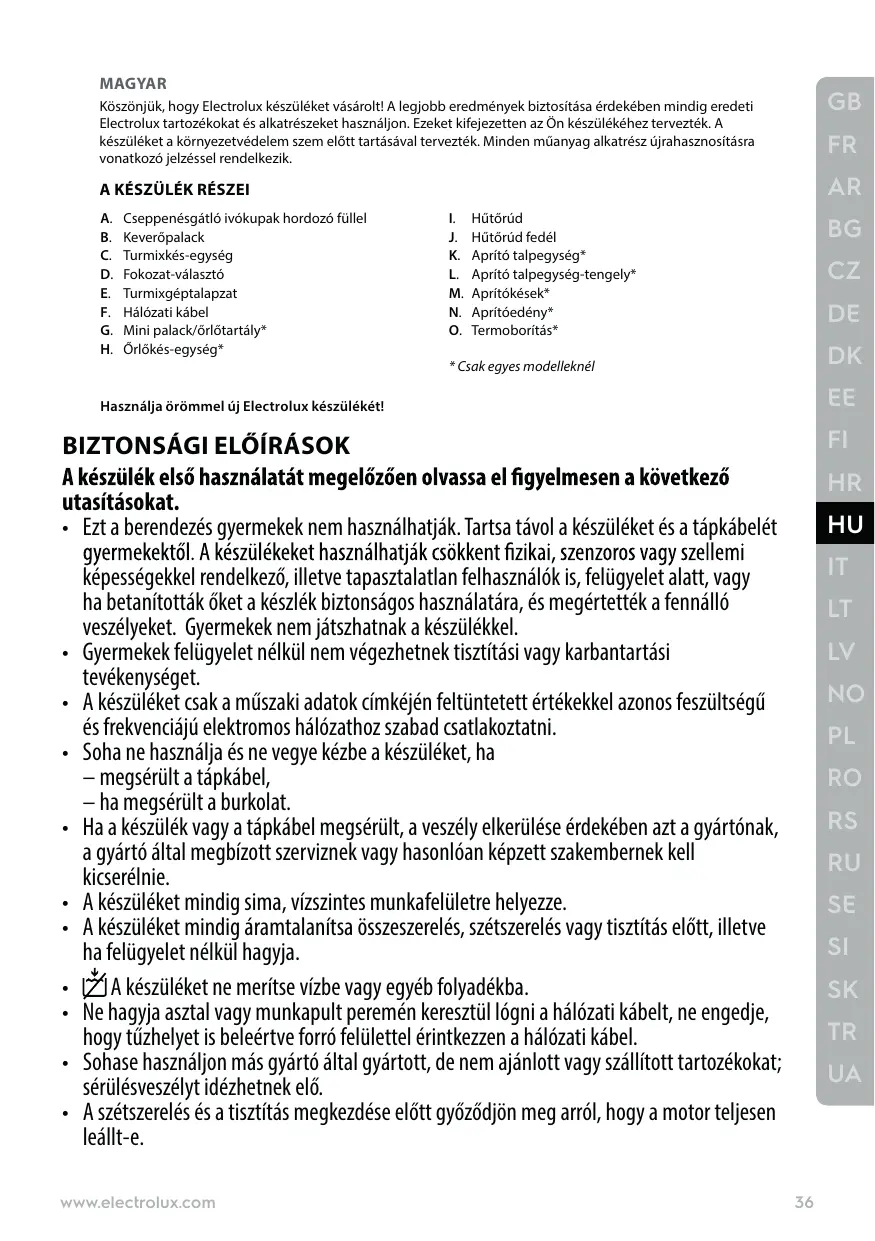 képességekkel rendelkező, illetve tapasztalatlan felhasználók is, felügyelet alatt, vagy ha betanították őket a készlék biztonságos használatára, és megértették a fennálló veszélyeket. Gyermekek nem játszhatnak a készülékkel. Gyermekek felügyelet nélkül nem végezhetnek tisztítási vagy karbantartási tevékenységet. A készüléket csak a műszaki adatok címkéjén feltüntetett értékekkel azonos feszültségű és frekvenciájú elektromos hálózathoz szabad csatlakoztatni. Soha ne használja és ne vegye kézbe a készüléket, ha – megsérült a tápkábel, – ha megsérült a burkolat. Ha a készülék vagy a tápkábel megsérült, a veszély elkerülése érdekében azt a gyártónak, a gyártó által megbízott szerviznek vagy hasonlóan képzett szakembernek kell kicserélnie. A készüléket mindig sima, vízszintes munkafelületre helyezze. A készüléket mindig áramtalanítsa összeszerelés, szétszerelés vagy tisztítás előtt, illetve ha felügyelet nélkül hagyja. A készüléket ne merítse vízbe vagy egyéb folyadékba. Ne hagyja asztal vagy munkapult peremén keresztül lógni a hálózati kábelt, ne engedje, hogy tűzhelyet is beleértve forró felülettel érintkezzen a hálózati kábel. Sohase használjon más gyártó által gyártott, de nem ajánlott vagy szállított tartozékokat; sérülésveszélyt idézhetnek elő. A szétszerelés és a tisztítás megkezdése előtt győződjön meg arról, hogy a motor teljesen leállt-e. www.electrolux.com