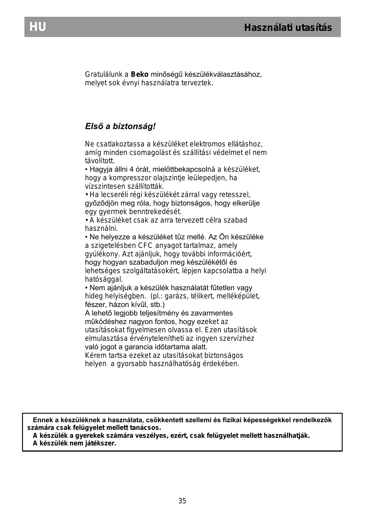 Első a biztonság! Ne csatlakoztassa a készüléket elektromos ellátáshoz, amíg minden csomagolást és szállítási védelmet el nem távolított. • Hagyja állni 4 órát, mielőttbekapcsolná a készüléket, hogy a kompresszor olajszintje leülepedjen, ha vízszintesen szállították. • Ha lecseréli régi készülékét zárral vagy retesszel, győződjön meg róla, hogy biztonságos, hogy elkerülje egy gyermek benntrekedését. • A készüléket csak az arra tervezett célra szabad használni. • Ne helyezze a készüléket tűz mellé. Az Ön készüléke a szigetelésben CFC anyagot tartalmaz, amely gyúlékony. Azt ajánljuk, hogy további információért, hogy hogyan szabaduljon meg készülékétől és lehetséges szolgáltatásokért, lépjen kapcsolatba a helyi hatósággal. • Nem ajánljuk a készülék használatát fűtetlen vagy hideg helyiségben. (pl.: garázs, télikert, melléképület, fészer, házon kívűl, stb.) A lehető legjobb teljesítmény és zavarmentes működéshez nagyon fontos, hogy ezeket az utasításokat figyelmesen olvassa el. Ezen utasítások elmulasztása érvénytelenítheti az ingyen szervízhez való jogot a garancia időtartama alatt. Kérem tartsa ezeket az utasításokat biztonságos helyen a gyorsabb használhatóság érdekében.