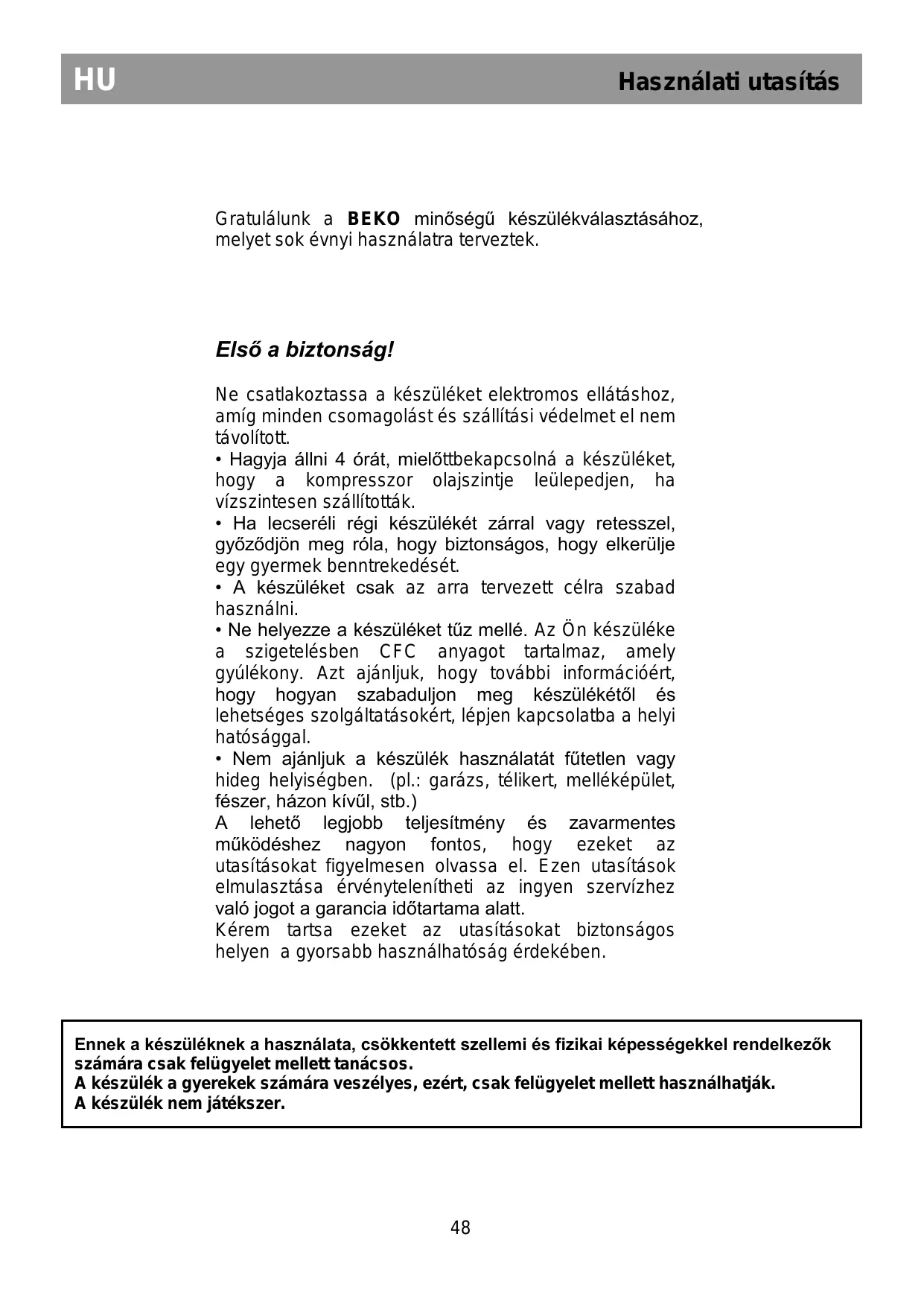 La sécurité d’abord ! Ne connectez pas votre appareil à l’alimentation électrique avant d’avoir enlevé tous les emballages et protections de transport. • Attendez au moins 4 heures avant de le brancher pour permettre à l’huile du compresseur de se stabiliser si l’appareil a été transporté couché. • Si vous vous débarrassez d'un vieil appareil à ressort ou loquet intégré à la porte, prenez soin de le rendre hors de danger pour éviter que les enfants ne s'enferment à l’intérieur. • L’utilisation de cet appareil s’applique uniquement à l’usage prévu. • Ne vous débarrassez pas de l’appareil dans un feu. L’isolation de votre appareil contient des substances non CFC qui sont inflammables. Veuillez contacter les autorités locales pour obtenir des renseignements concernant la mise au rebut et les endroits existants. • L’utilisation de cet appareil dans une pièce froide, non chauffée n’est pas recommandée (garage, jardin d'hiver, annexe, abri, remise, etc.). Afin d’obtenir les meilleurs résultats possibles et un fonctionnement sans encombres de votre appareil, veuillez lire ces instructions attentivement. Le non-respect de ces instructions pourrait annuler votre droit à l'assistance sans frais pendant la période de garantie. Veuillez conserver ces instructions soigneusement à titre de référence pratique. Les pièces détachées d’origine sont disponibles pendant 10 ans, à compter de la date d’achat du produit.