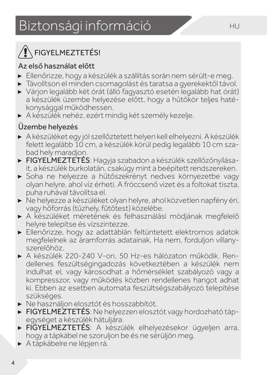 HU FIGYELMEZTETÉS! Az első használat előtt ▶ Ellenőrizze, hogy a készülék a szállítás során nem sérült-e meg. ▶ Távolítson el minden csomagolást és taratsa a gyerekektől távol. ▶ Várjon legalább két órát (álló fagyasztó esetén legalább hat órát) a készülék üzembe helyezése előtt, hogy a hűtőkör teljes hatékonysággal működhessen. ▶ A készülék nehéz, ezért mindig két személy kezelje. Üzembe helyezés ▶ A készüléket egy jól szellőztetett helyen kell elhelyezni. A készülék felett legalább 10 cm, a készülék körül pedig legalább 10 cm szabad hely maradjon. ▶ FIGYELMEZTETÉS: Hagyja szabadon a készülék szellőzőnyílásait, a készülék burkolatán, csakúgy mint a beépített rendszereken. ▶ Soha ne helyezze a hűtőszekrényt nedves környezetbe vagy olyan helyre, ahol víz érheti. A fröccsenő vizet és a foltokat tiszta, puha ruhával távolítsa el. ▶ Ne helyezze a készüléket olyan helyre, ahol közvetlen napfény éri, vagy hőforrás (tűzhely, fűtőtest) közelébe. ▶ A készüléket méretének és felhasználási módjának megfelelő helyre telepítse és vízszintezze. ▶ Ellenőrizze, hogy az adattáblán feltüntetett elektromos adatok megfelelnek az áramforrás adatainak. Ha nem, forduljon villanyszerelőhöz. ▶ A készülék 220-240 V-on, 50 Hz-es hálózaton működik. Rendellenes feszültségingadozás következtében a készülék nem indulhat el, vagy károsodhat a hőmérséklet szabályozó vagy a kompresszor, vagy működés közben rendellenes hangot adhat ki. Ebben az esetben automata feszültségszabályozó telepítése szükséges. ▶ Ne használjon elosztót és hosszabbítót. ▶ FIGYELMEZTETÉS: Ne helyezzen elosztót vagy hordozható tápegységet a készülék hátuljára. ▶ FIGYELMEZTETÉS: A készülék elhelyezésekor ügyeljen arra, hogy a tápkábel ne szoruljon be és ne sérüljön meg. ▶ A tápkábelre ne lépjen rá. 4