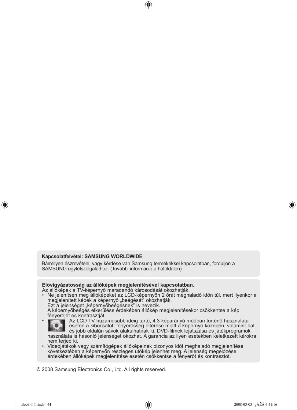 - Ne jelenítsen meg állóképeket az LCD-képernyőn 2 órát meghaladó időn túl, mert ilyenkor a megjelenített képek a képernyő „beégését” okozhatják. Ezt a jelenséget „képernyőbeégésnek” is nevezik. A képernyőbeégés elkerülése érdekében állókép megjelenítésekor csökkentse a kép fényerejét és kontrasztját. Az LCD TV huzamosabb ideig tartó, 4:3 képarányú módban történő használata esetén a kibocsátott fényerősség eltérése miatt a képernyő közepén, valamint bal és jobb oldalán sávok alakulhatnak ki. DVD-filmek lejátszása és játékprogramok használata is hasonló jelenséget okozhat. A garancia az ilyen esetekben keletkezett károkra nem terjed ki.