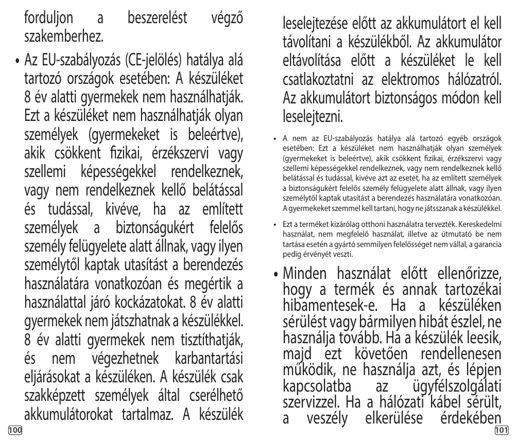• Pour les pays soumis à la réglementation UE (marquage CE) : Cet appareil ne doit pas être utilisé par des enfants. Cet appareil peut être utilisé par des personnes ayant des capacités physiques, sensorielles ou mentales réduites ou dénuées d’expérience ou de connaissance, s'ils (si elles) sont correctement surveillé(e)s ou si des instructions relatives à l'utilisation de l'appareil en toute sécurité leur ont été données et si les risques encourus ont été appréhendés. Les enfants ne doivent pas jouer avec l’appareil. Cet appareil contient des batteries qui ne peuvent être remplacées que par des personnes qualifiées. Le nettoyage et l'entretien par l'usager ne doivent pas être effectués par des enfants. La batterie doit être retirée de 10
