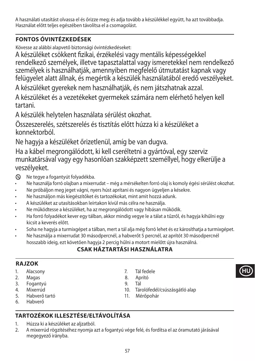 Les enfants ne doivent pas utiliser ni jouer avec l'appareil. Tenez l'appareil et le câble hors de portée des enfants. Une utilisation inappropriée de l'appareil peut causer des blessures. Débranchez l'appareil avant le montage, le démontage ou le nettoyage. Ne laissez pas l’appareil sans surveillance lorsqu’il est branché. Si le câble est abîmé, vous devez le faire remplacer par le fabricant, un de ses techniciens agréés ou une personne également qualifiée, pour éviter tout danger. H • • N’essayez pas de piler de la glace ou de hacher de la viande crue et faites attention aux lames. N’adaptez pas d’accessoires autres que ceux fournis. N’utilisez pas l’appareil dans un autre but que celui décrit dans ces instructions. N’utilisez pas l’appareil s’il est endommagé ou s’il ne fonctionne pas correctement. Si vous mélangez des liquides chauds dans une casserole, retirez dans tous les cas la casserole de la source de chaleur et laissez-la refroidir un peu avant de procéder au mélange. Ne laissez en aucun cas le mélangeur dans la casserole, car le fond de cette dernière pourrait être encore très chaud et endommager le mélangeur. Ne pas utiliser le batteur pendant plus de 30 secondes, le fouet pendant plus de 5 minutes, le hachoir pendant plus de 30 secondes. Laissez le moteur refroidir pendant 2 minutes avant d’utiliser à nouveau ces accessoires.