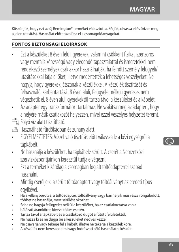 Peut être nettoyé sous un robinet d’eau courante. E Peut être utilisé dans la baignoire ou la douche. • AVERTISSEMENT : Séparez la composante portable du câble d’alimentation avant de nettoyer l’appareil dans l’eau. • N’utilisez pas cet appareil si le cordon d’alimentation est endommagé. Vous pouvez obtenir un cordon de rechange en contactant notre Service Consommateurs. • Cet appareil doit être utilisé exclusivement avec l’adaptateur de chargement fourni. • Veuillez toujours remplacer un adaptateur ou un socle de chargement endommagé par une pièce d’origine. • Veillez à ne pas brancher ni débrancher l’appareil avec les mains mouillées. Ne pas tordre et enrouler le cordon autour de l’appareil. Cet appareil n’est pas destiné à une utilisation commerciale ou en salon.