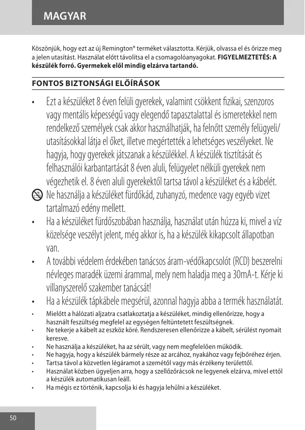 • Lorsque l’appareil est utilisé dans une salle de bains, débranchez-le après usage. La proximité de l’eau présente un danger même lorsque l’appareil est éteint. • Pour une protection supplémentaire, l’installation de courant résiduel (RCD) avec un differentiel residuel nominal ne dépassant pas 30mA est recommandée. Demandez de l’aide à un électricien. • Si le cordon d’alimentation de cet appareil est endommagé, cessez immédiatement d’utiliser l’appareil et renvoyez-le au service consommateurs Remington agréé le plus proche en vue de sa réparation ou de sa substitution afin d’éviter tout risque. • •