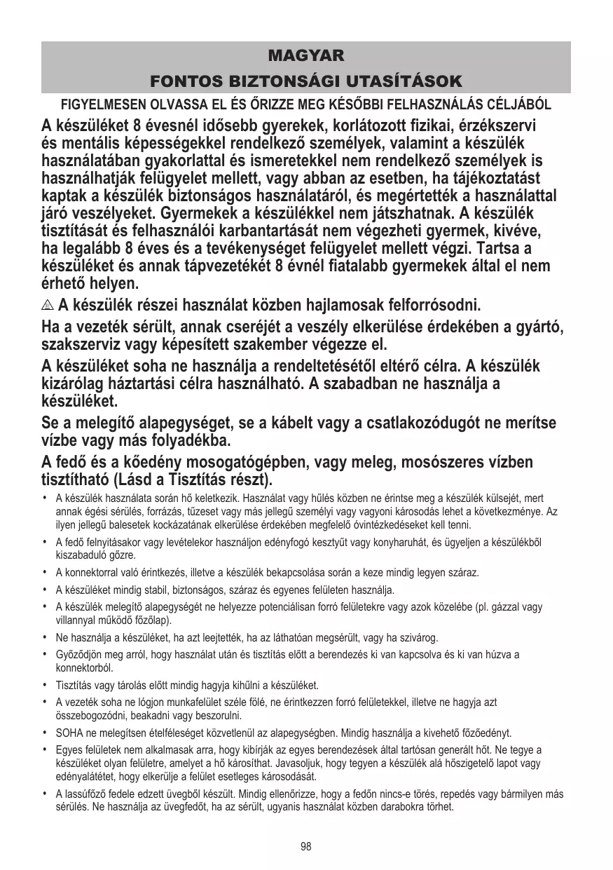 annak égési sérülés, forrázás, tűzeset vagy más jellegű személyi vagy vagyoni károsodás lehet a következménye. Az ilyen jellegű balesetek kockázatának elkerülése érdekében megfelelő óvintézkedéseket kell tenni. A fedő felnyitásakor vagy levételekor használjon edényfogó kesztyűt vagy konyharuhát, és ügyeljen a készülékből kiszabaduló gőzre. A konnektorral való érintkezés, illetve a készülék bekapcsolása során a keze mindig legyen száraz. A készüléket mindig stabil, biztonságos, száraz és egyenes felületen használja. A készülék melegítő alapegységét ne helyezze potenciálisan forró felületekre vagy azok közelébe (pl. gázzal vagy villannyal működő főzőlap). Ne használja a készüléket, ha azt leejtették, ha az láthatóan megsérült, vagy ha szivárog. Győződjön meg arról, hogy használat után és tisztítás előtt a berendezés ki van kapcsolva és ki van húzva a konnektorból. Tisztítás vagy tárolás előtt mindig hagyja kihűlni a készüléket. A vezeték soha ne lógjon munkafelület széle fölé, ne érintkezzen forró felületekkel, illetve ne hagyja azt összebogozódni, beakadni vagy beszorulni. SOHA ne melegítsen ételféleséget közvetlenül az alapegységben. Mindig használja a kivehető főzőedényt. Egyes felületek nem alkalmasak arra, hogy kibírják az egyes berendezések által tartósan generált hőt. Ne tegye a készüléket olyan felületre, amelyet a hő károsíthat. Javasoljuk, hogy tegyen a készülék alá hőszigetelő lapot vagy edényalátétet, hogy elkerülje a felület esetleges károsodását. A lassúfőző fedele edzett üvegből készült. Mindig ellenőrizze, hogy a fedőn nincs-e törés, repedés vagy bármilyen más sérülés. Ne használja az üvegfedőt, ha az sérült, ugyanis használat közben darabokra törhet. 98