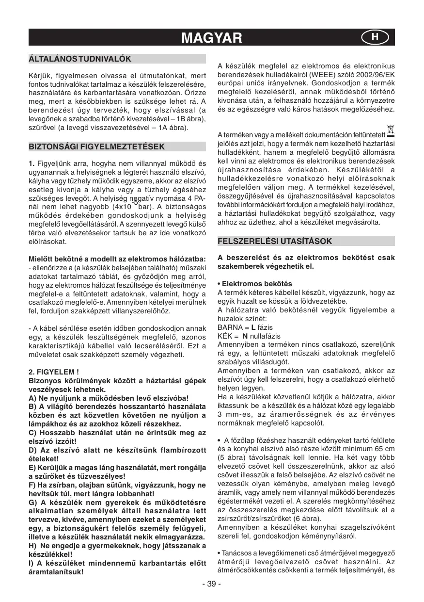 Bizonyos körülmények között a háztartási gépek veszélyesek lehetnek. A) Ne nyúljunk a működésben levő elszívóba! B) A világító berendezés hosszantartó használata közben és azt közvetlen követően ne nyúljon a lámpákhoz és az azokhoz közeli részekhez. C) Hosszabb használat után ne érintsük meg az elszívó izzóit! D) Az elszívó alatt ne készítsünk flambírozott ételeket! E) Kerüljük a magas láng használatát, mert rongálja a szűrőket és tűzveszélyes! F) Ha zsírban, olajban sütünk, vigyázzunk, hogy ne hevítsük túl, mert lángra lobbanhat! G) A készülék nem gyerekek és működtetésre alkalmatlan sz emélyek általi használatra lett tervezve, kivéve, amennyiben ezeket a személyeket egy, a biztonságukért felelős személy felügyeli, illetve a készülék használatát nekik elmagyarázza. H) Ne engedje a gyermekeknek, hogy játsszanak a készülékkel!