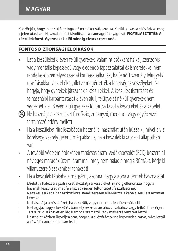 • Ezt a készüléket 8 éven felüli gyerekek, valamint csökkent fizikai, szenzoros vagy mentális képességű vagy elegendő tapasztalattal és ismeretekkel nem rendelkező személyek csak akkor használhatják, ha felnőtt személy felügyeli/ utasításokkal látja el őket, illetve megértették a lehetséges veszélyeket. Ne hagyja, hogy gyerekek játszanak a készülékkel. A készülék tisztítását és felhasználói karbantartását 8 éven aluli, felügyelet nélküli gyerekek nem végezhetik el. 8 éven aluli gyerekektől tartsa távol a készüléket és a kábelét. L Ne használja a készüléket fürdőkád, zuhanyzó, medence vagy egyéb vizet tartalmazó edény mellett. • Ha a készüléket fürdőszobában használja, használat után húzza ki, mivel a víz közelsége veszélyt jelent, még akkor is, ha a készülék kikapcsolt állapotban van. • A további védelem érdekében tanácsos áram-védőkapcsolót (RCD) beszerelni névleges maradék üzemi árammal, mely nem haladja meg a 30mA-t. Kérje ki villanyszerelő szakember tanácsát! • Ha a készülék tápkábele megsérül, azonnal hagyja abba a termék használatát. • • • • • •