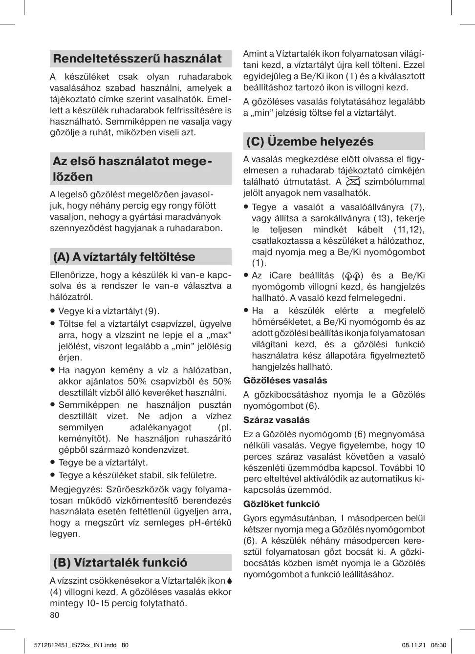 (B) Víztartalék funkció A vízszint csökkenésekor a Víztartalék ikon (4) villogni kezd. A gőzöléses vasalás ekkor mintegy 10-15 percig folytatható.