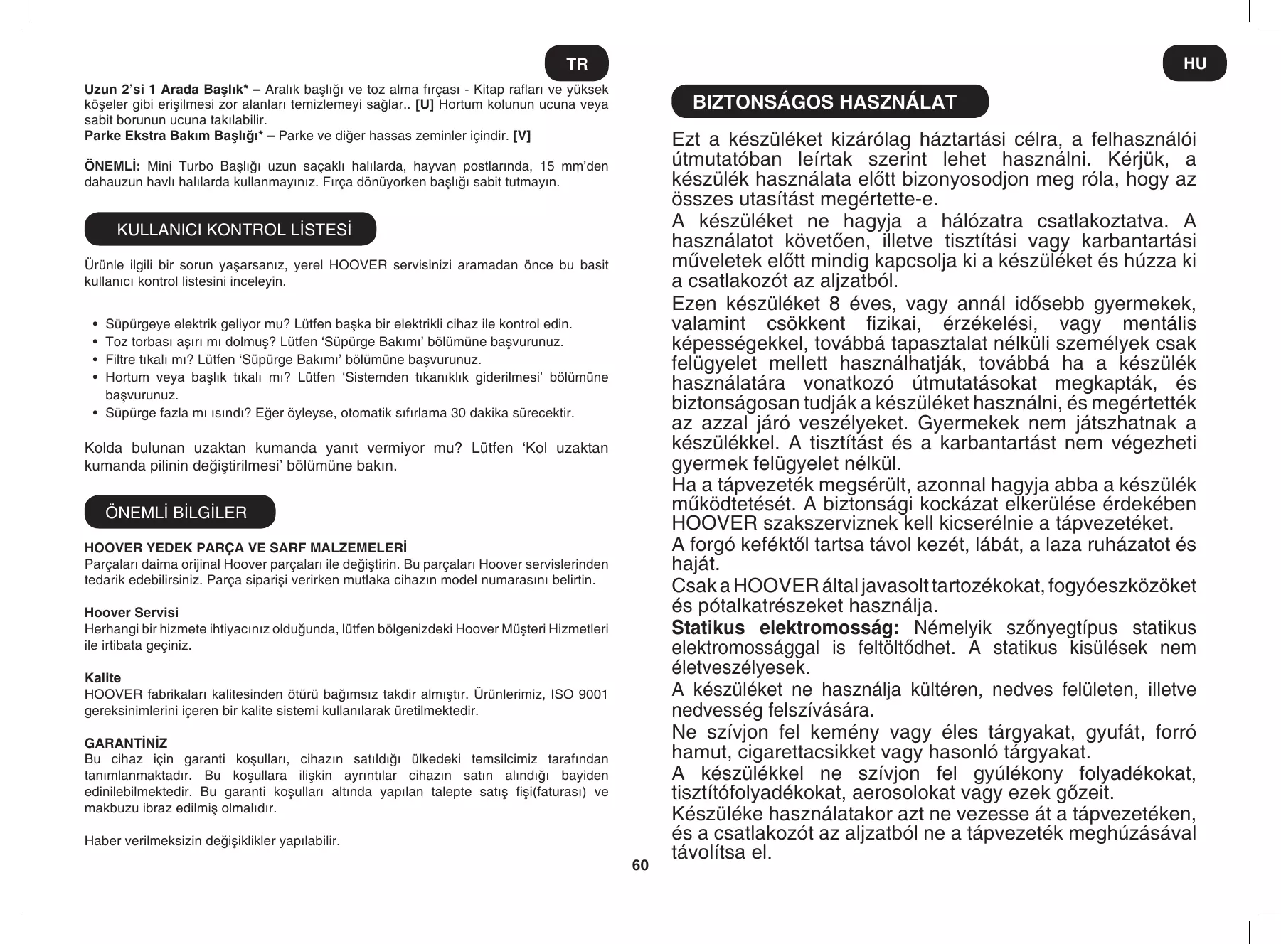 Ezt a készüléket kizárólag háztartási célra, a felhasználói útmutatóban leírtak szerint lehet használni. Kérjük, a készülék használata előtt bizonyosodjon meg róla, hogy az összes utasítást megértette-e. A készüléket ne hagyja a hálózatra csatlakoztatva. A használatot követően, illetve tisztítási vagy karbantartási műveletek előtt mindig kapcsolja ki a készüléket és húzza ki a csatlakozót az aljzatból. Ezen készüléket 8 éves, vagy annál idősebb gyermekek, valamint csökkent fizikai, érzékelési, vagy mentális képességekkel, továbbá tapasztalat nélküli személyek csak felügyelet mellett használhatják, továbbá ha a készülék használatára vonatkozó útmutatásokat megkapták, és biztonságosan tudják a készüléket használni, és megértették az azzal járó veszélyeket. Gyermekek nem játszhatnak a készülékkel. A tisztítást és a karbantartást nem végezheti gyermek felügyelet nélkül. Ha a tápvezeték megsérült, azonnal hagyja abba a készülék működtetését. A biztonsági kockázat elkerülése érdekében HOOVER szakszerviznek kell kicserélnie a tápvezetéket. A forgó keféktől tartsa távol kezét, lábát, a laza ruházatot és haját. Csak a HOOVER által javasolt tartozékokat, fogyóeszközöket és pótalkatrészeket használja. Statikus elektromosság: Némelyik szőnyegtípus statikus elektromossággal is feltöltődhet. A statikus kisülések nem életveszélyesek. A készüléket ne használja kültéren, nedves felületen, illetve nedvesség felszívására. Ne szívjon fel kemény vagy éles tárgyakat, gyufát, forró hamut, cigarettacsikket vagy hasonló tárgyakat. A készülékkel ne szívjon fel gyúlékony folyadékokat, tisztítófolyadékokat, aerosolokat vagy ezek gőzeit. Készüléke használatakor azt ne vezesse át a tápvezetéken, és a csatlakozót az aljzatból ne a tápvezeték meghúzásával távolítsa el.