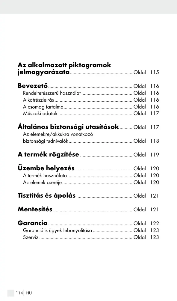 Az alkalmazott piktogramok jelmagyarázata Oldal 115 Bevezető Oldal 116 Rendeltetésszerű használat Oldal Alkatrészleírás Oldal A csomag tartalma Oldal Műszaki adatok Oldal