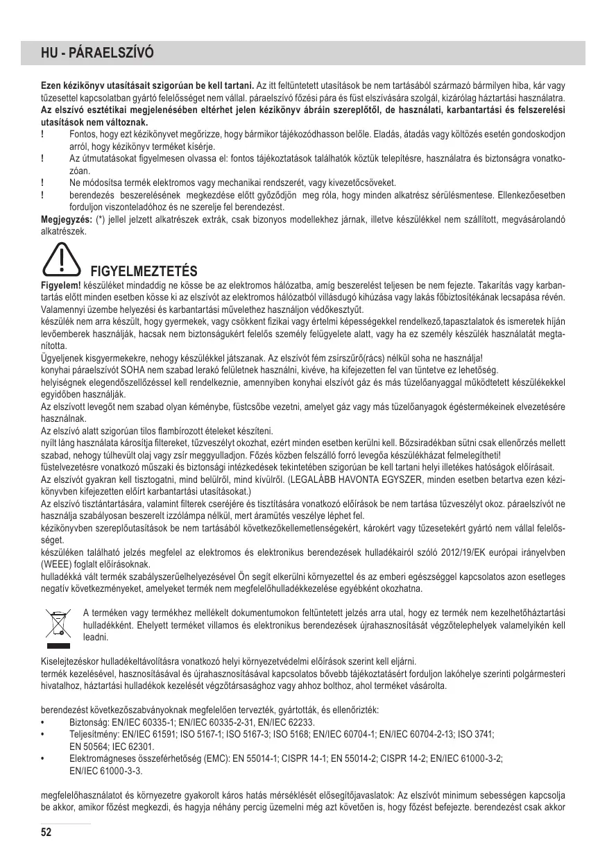 FIGYELMEZTETÉS Figyelem! készüléket mindaddig ne kösse be az elektromos hálózatba, amíg beszerelést teljesen be nem fejezte. Takarítás vagy karbantartás előtt minden esetben kösse ki az elszívót az elektromos hálózatból villásdugó kihúzása vagy lakás főbiztosítékának lecsapása révén. Valamennyi üzembe helyezési és karbantartási művelethez használjon védőkesztyűt. készülék nem arra készült, hogy gyermekek, vagy csökkent fizikai vagy értelmi képességekkel rendelkező,tapasztalatok és ismeretek híján levőemberek használják, hacsak nem biztonságukért felelős személy felügyelete alatt, vagy ha ez személy készülék használatát megtanította. Ügyeljenek kisgyermekekre, nehogy készülékkel játszanak. Az elszívót fém zsírszűrő(rács) nélkül soha ne használja! konyhai páraelszívót SOHA nem szabad lerakó felületnek használni, kivéve, ha kifejezetten fel van tüntetve ez lehetőség. helyiségnek elegendőszellőzéssel kell rendelkeznie, amennyiben konyhai elszívót gáz és más tüzelőanyaggal működtetett készülékekkel egyidőben használják. Az elszívott levegőt nem szabad olyan kéménybe, füstcsőbe vezetni, amelyet gáz vagy más tüzelőanyagok égéstermékeinek elvezetésére használnak. Az elszívó alatt szigorúan tilos flambírozott ételeket készíteni. nyílt láng használata károsítja filtereket, tűzveszélyt okozhat, ezért minden esetben kerülni kell. Bőzsiradékban sütni csak ellenőrzés mellett szabad, nehogy túlhevült olaj vagy zsír meggyulladjon. Főzés közben felszálló forró levegőa készülékházat felmelegítheti! füstelvezetésre vonatkozó műszaki és biztonsági intézkedések tekintetében szigorúan be kell tartani helyi illetékes hatóságok előírásait. Az elszívót gyakran kell tisztogatni, mind belülről, mind kívülről. (LEGALÁBB HAVONTA EGYSZER, minden esetben betartva ezen kézikönyvben kifejezetten előírt karbantartási utasításokat.) Az elszívó tisztántartására, valamint filterek cseréjére és tisztítására vonatkozó előírások be nem tartása tűzveszélyt okoz. páraelszívót ne használja szabályosan beszerelt izzólámpa nélkül, mert áramütés veszélye léphet fel. kézikönyvben szereplőutasítások be nem tartásából következőkellemetlenségekért, károkért vagy tűzesetekért gyártó nem vállal felelősséget. készüléken található jelzés megfelel az elektromos és elektronikus berendezések hulladékairól szóló 2012/19/EK európai irányelvben (WEEE) foglalt előírásoknak. hulladékká vált termék szabályszerűelhelyezésével Ön segít elkerülni környezettel és az emberi egészséggel kapcsolatos azon esetleges negatív következményeket, amelyeket termék nem megfelelőhulladékkezelése egyébként okozhatna. A terméken vagy termékhez mellékelt dokumentumokon feltüntetett jelzés arra utal, hogy ez termék nem kezelhetőháztartási hulladékként. Ehelyett terméket villamos és elektronikus berendezések újrahasznosítását végzőtelephelyek valamelyikén kell leadni. Kiselejtezéskor hulladékeltávolításra vonatkozó helyi környezetvédelmi előírások szerint kell eljárni. termék kezelésével, hasznosításával és újrahasznosításával kapcsolatos bővebb tájékoztatásért forduljon lakóhelye szerinti polgármesteri hivatalhoz, háztartási hulladékok kezelését végzőtársasághoz vagy ahhoz bolthoz, ahol terméket vásárolta. berendezést következőszabványoknak megfelelően tervezték, gyártották, és ellenőrizték: •• Biztonság: EN/IEC 60335-1; EN/IEC 60335-2-31, EN/IEC 62233. •• Teljesítmény: EN/IEC 61591; ISO 5167-1; ISO 5167-3; ISO 5168; EN/IEC 60704-1; EN/IEC 60704-2-13; ISO 3741; EN 50564; IEC 62301. •• Elektromágneses összeférhetőség (EMC): EN 55014-1; CISPR 14-1; EN 55014-2; CISPR 14-2; EN/IEC 61000-3-2; EN/IEC 61000-3-3. megfelelőhasználatot és környezetre gyakorolt káros hatás mérséklését elősegítőjavaslatok: Az elszívót minimum sebességen kapcsolja be akkor, amikor főzést megkezdi, és hagyja néhány percig üzemelni még azt követően is, hogy főzést befejezte. berendezést csak akkor