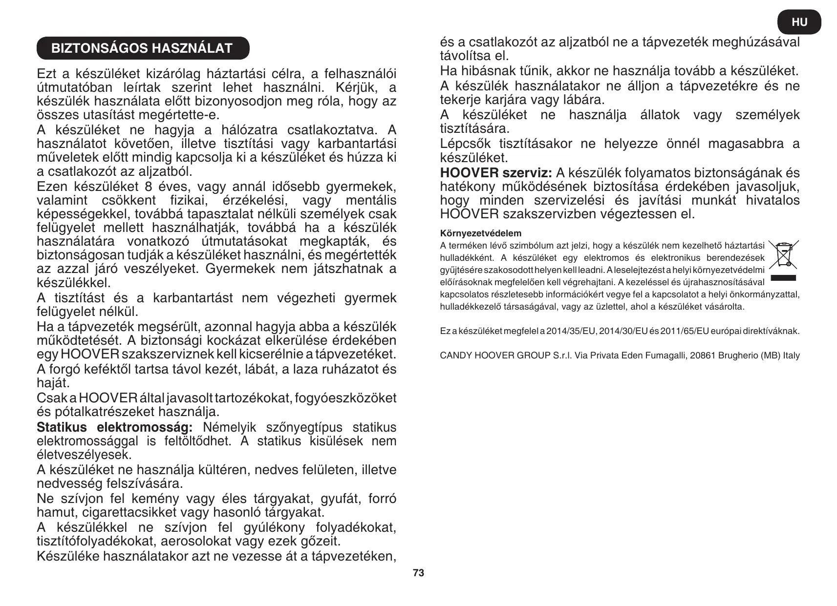 HASZNÁLATI ÚTMUTATÓ HP710PAR HOOVER