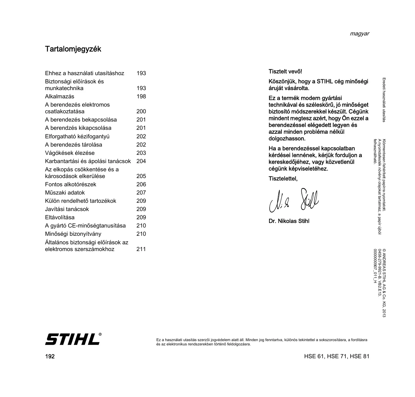 magyar Tartalomjegyzék Ehhez a hasznälati utasitäshoz 193 Tisztelt vevô! Biztonsägi elôiräsok és Kôszônjük, hogy a STIHL cég minôségi dl munkatechnika 193 ärujät vâsärolta. È Alkalmazäs 198 Ez a termék modern gyärtési î A berendezés elektromos technikäval és széleskôrü, jé minéséget Es csatlakoztatäsa 200 biztosité médszerekkel készült. Cégünk A berendezés bekapcsoläsa 201 mindent megtesz azért, hogy Ôn ezzel a A berendzés kikapcsoläsa 201 berendezéssel elégedett legyen és ne u azzal minden probléma nélkül Elforgathaté kézifogantyü 202 dolgozhasson. 2>z À berendezés téroläsa 202 Ha a berendezéssel kapcsolatban É El Vägékések élezése 203 kérdései lennének, kérjük forduljon a 2£ a Karbantartäsi és âpoläsi tanäcsok 204 kereskedôjéhez, vagy kôzvetlenül ê ë 2 Az elkopäs csôkkentése és a cégünk képviseletéhez. ÉEs kärosodäsok elkerülése 205 Tisztelettel, Ê Fontos alkotérészek 206 Müszaki adatok 207 Külôn rendelheté tartozékok 209 dl 4 ] Javitési tanäcsok 209 / Eltévolitäsa 209 Dr. Nikolas Stihl A gyärté CE-minôségtanusitésa 210 Minôségi bizonyitväny 210 Altalänos biztonsägi elirasok az elektromos szerszämokhoz 211 H°+1072060000000 £L3 28 ‘8-1266-6/7-86P0