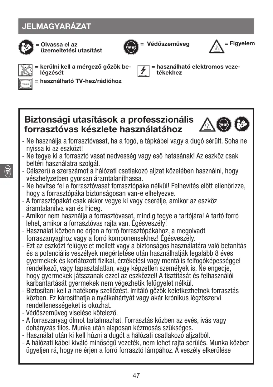 - Ne pas utiliser le fer à souder lorsque la poignée, la conduite électrique ou la fiche sont endommagées. Ne jamais ouvrir l'appareil !