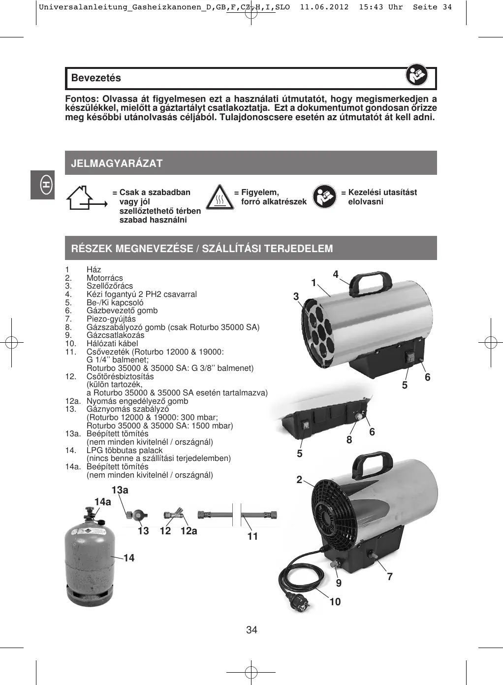 12000, 19000) ou 1500 mbars (Roturbo 35000, 35000 SA). Utilisez exclusivement des bouteilles réutilisables de GPL (différences de taille en fonction des pays, par ex. Allemagne 5 kg, 11 kg ou 33 kg). Il peut être dangereux d'essayer de raccorder d'autres types de réservoirs de gaz.
