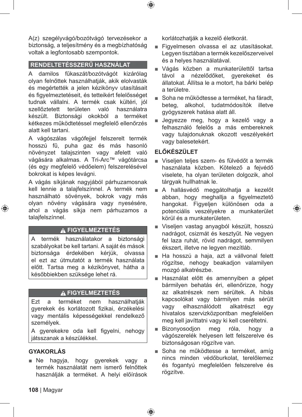 Une projection de la lame survenir sans prévenir si elle s'accroche, se bloque ou se coince. Ceci est surtout susceptible de se produire dans des zones où il est difficile de voir les éléments en cours de coupe. Pour une coupe plus sûre et plus facile, attaquez les herbes à couper de la droite vers la gauche. En cas de contact inattendu avec un objet ou une souche, la réaction de rebond en sera minimisée. Utilisez toujours vos deux mains pour contrôler ce produit.