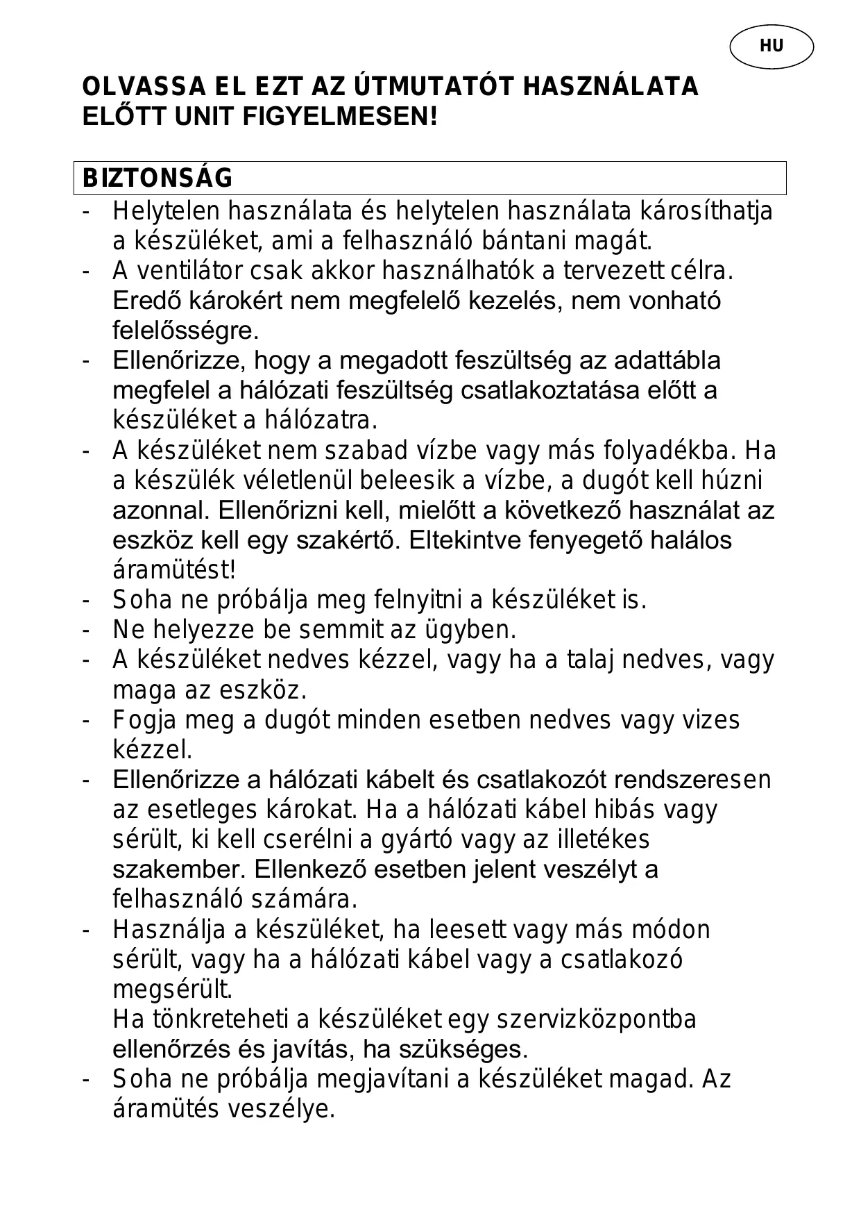 CHD OLVASSA EL EZT AZ ÜTMUTATÔT HASZNALATA ELÔTT UNIT FIGYELMESEN! BIZTONSAÂG - Helytelen hasznälata és helytelen hasznélata kérosithatja a készüléket, ami a felhasznélé bântani magét. - À ventilétor csak akkor hasznélhaték a tervezett célra. Eredô kärokért nem megfelelé kezelés, nem vonhato felelésségre. -_ Ellenôrizze, hogy a megadott feszültség az adattébla megfelel a hälôzati feszültség csatlakoztatäsa elôtt a készüléket a hélézatra. - À készüléket nem szabad vizbe vagy més folyadékba. Ha a készülék véletlenül beleesik a vizbe, a dugôt kell hüzni azonnal. Ellenérizni kell, mielôtt a kKôvetkez6 hasznälat az eszkôz kell egy szakértô. Eltekintve fenyeget6 halälos aramütést! - Soha ne prôbélja meg felnyitni a készüléket is. - Ne helyezze be semmit az ügyben. - À készüléket nedves kézzel, vagy ha a talaj nedves, vagy maga az eszküz. -_ Fogja meg a dugét minden esetben nedves vagy vizes kézzel. -_ Ellenôrizze a hälôzati käbelt és csatlakozôt rendszeresen az esetleges kérokat. Ha a hélézati käbel hibés vagy sérült, ki kell cseréini a gyärté vagy az illetékes szakember. Ellenkezé esetben jelent veszélyt a felhasznélé szémära. - Hasznälja a készüléket, ha leesett vagy més médon sérült, vagy ha a hélézati kébel vagy a csatlakozé megsérült. Ha tônkreteheti a készüléket egy szervizkôzpontba ellenôrzés és javitäs, ha szükséges. - Soha ne prôbälja megjavitani a készüléket magad. Az aramütés veszélye.