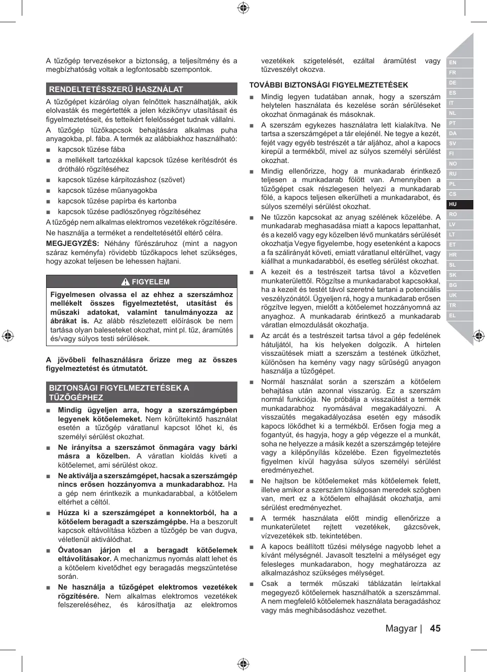 = Cet outil est conçu pour être utilisé d'une seule main. Ne maintenez pas l'outil par la partie avant du magasin. Ne mettez pas les mains, la tête ou une autre partie du corps à proximité du bas du compartiment où l'agrafe sort, car cela peut provoquer de graves blessures. = Assurez-vous toujours du bon contact avec la pièce à agrafer. Un contact partiel avec les pièces à agrafer peut entraîner le fait que l'agrafeuse passe totalement à côté de la pièce à fixer et provoque de graves blessures. N'introduisez pas d'agrafes sur le bord des matériaux. La pièce à agrafer peut se fendre et faire ricocher l'agrafe, ce qui peut vous blesser ou blesser un collègue. Sachez que la fixation peut suivre les aspérités du bois, ce qui peut provoquer une protubérance inattendue sur le côté de la pièce à agrafer, voire une déviation, et ainsi des blessures potentielles. = Gardez vos mains et votre corps éloignés du voisinage immédiat de la zone de travail. Maintenez la pièce avec des serre-joints lorsque cela est nécessaire afin de protéger vos mains et votre corps de tout danger potentiel. Assurez-vous du bon maintien de la pièce à fixer avant d'y apposer l'agrafeuse. Le contact avec la pièce à fixer peut entraîner son décalage de façon inattendue. = Gardez votre visage et votre corps éloignés de l'arrière de l'outil lorsque vous travaillez dans des endroits exigus. Un recul soudain peut provoquer un choc corporel, surtout quand on agrafe des matériaux denses ou durs. = En cours d'utilisation normale, l'outil subit un recul immédiatement après l'enfoncement d'une agrafe. Ceci est un fonctionnement normal de l'outil. Ne tentez pas d'éviter le recul en maintenant l'agrafeuse contre la pièce à agrafer. En empêchant le recul, vous pourriez provoquer l'insertion d'une deuxième agrafe par le produit. Saisissez fermement la poignée, laissez l'outi faire le travail et ne placez à aucun moment votre deuxième main sur le dessus de l'outil ou à proximité de la zone de sortie. Le non-respect de cet avertissement pourrait entraîner de graves blessures. N'agrafez pas par dessus d'autres agrafes ou en donnant trop d'angle à l'outil, ce qui risquerait de provoquer la déviation des agrafes et de possibles blessures. Vérifiez toujours l'éventuelle présence de câbles cachés, tuyaux de gaz ou d'eau, etc. avant d'utiliser le
