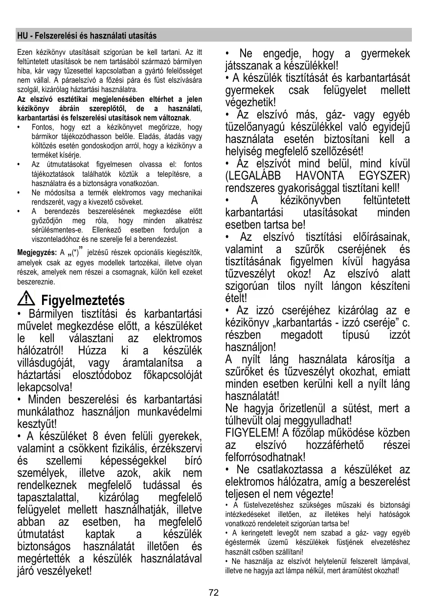 Ezen kézkônyv utasitésait szigordan be kell tartani. Az itt feltüntetett utasitésok be nem tartésébôl szärmazé bérmiyen hiba, kr vagy tüzesettel kapcsolalban a gyarté felelésséget nem vällal. À péraelszivé a fôzési péra és füst elsziväséra szolgél, Kizärélag héztartési hasznélatra.