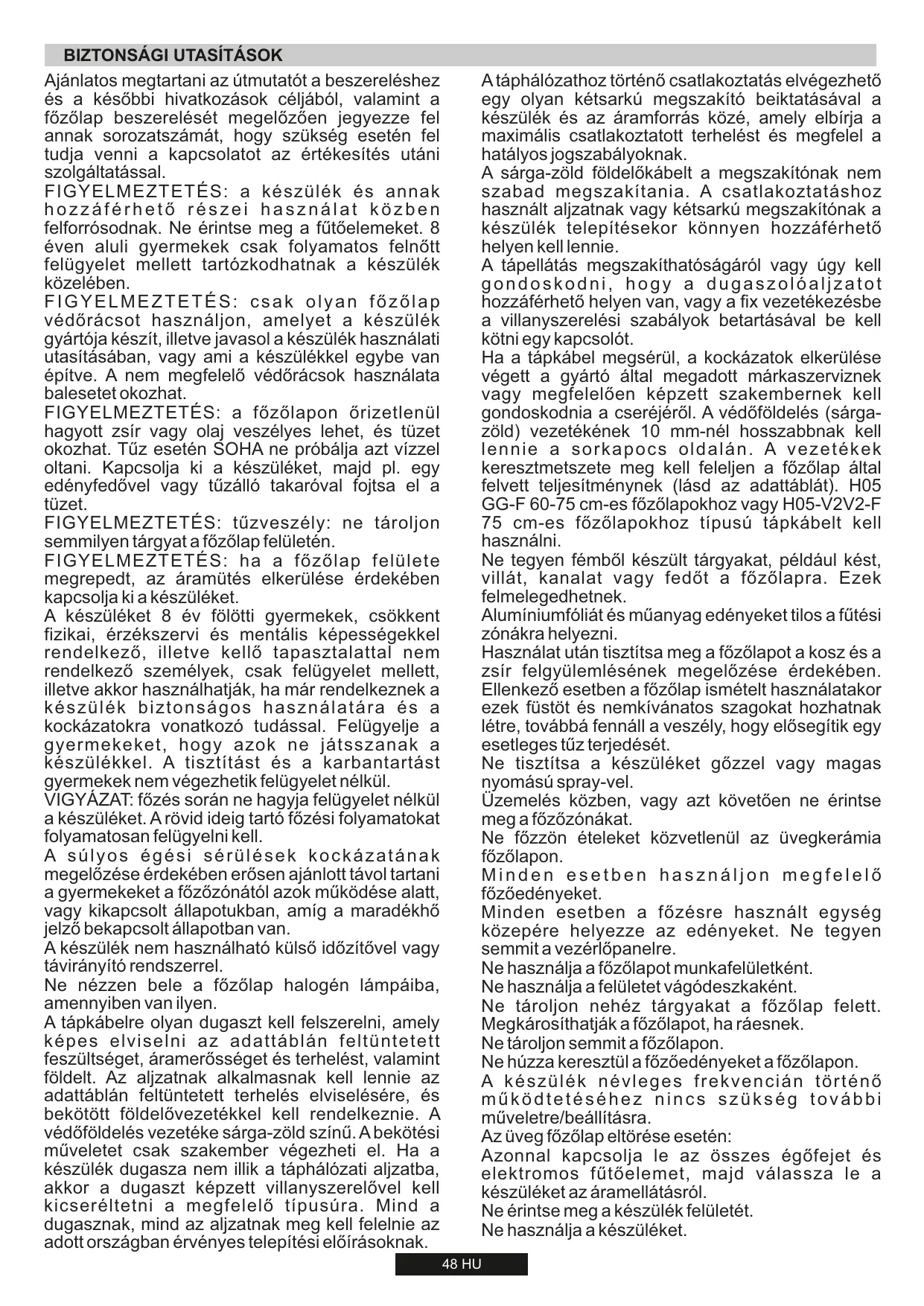 AVERTISSEMENT : l'appareil et ses parties accessibles chauffent pendant l'utilisation. Evitez de toucher les éléments chauffants. Les enfants de moins de 8 ans doivent être tenus hors de portée de l'appareil, sauf s'ils sont surveillés en permanence. AVERTISSEMENT : n'utilisez qu'un dispositif de rotection de votre table de cuisson conçu par le abricant de votre appareil ou indiqué, dans le manuel d'utilisation, comme étant compatible, ou bien le dispositif de protection fourni avec l'appareil. L'utilisation d'un dispositif de protection non approprié peut causer des accidents. AVERTISSEMENT : l'utilisation de la table de cuisson sans surveillance avec manipulation de graisse ou d'huile peut être dangereux et provoquer un incendie. N'essayez JAMAÏS d'éteindre un feu avec de l'eau, mais éteignez l'appareil, puis couvrez la flamme avec un couvercle où une couverture anti-feu, par exemple. AVERTISSEMENT, risque d'incendie : ne stockez pas d'éléments sur les surfaces de cuisson. AVERTISSEMENT : si la surface est fissurée, ne touchez pas le verre de la table et éteignez l'appareil pour éviter tout risque d'électrocution. Cet appareil peut être utilisé par des enfants âgés de 8 ans et plus, par des personnes dont les capacités physiques, sensorielles ou mentales sont réduites où par des personnes dénuées d'expérience et de connaissances, mais qui ont été informées sur la manière d'utiliser l'appareil en toute sécurité, si elles comprennent les risques impliqués. Surveillez les enfants afin qu'ils ne jouent pas avec l'appareil. L'entretien et le nettoyage ne doivent pas être effectués par des enfants Sans surveillance. ATTENTION : la cuisson demande d'être surveillée. Les cuissons de courte durée doivent être surveillées en permanence. Il est chaudement recommandé d'éloigner les enfants de la zone de cuisson lorsqu'elle fonctionne ou même quand elle est éteinte, mais que l'indicateur de chaleur résiduelle est encore visible, afin d'éviter tout risque de brûlures graves. Cet appareil n'est pas conçu pour être actionné par un temporisateur externe ou un système séparé de commande à distance. Si votre table de cuisson est dotée d'éléments halogènes, n'en fixez pas la lumière. Brancher le câble d'alimentation sur une prise de courant qui supporte le voltage (le courant et la charge sont indiqués sur l'étiquette) et vérifier la présence d'une mise à la terre. La prise d'alimentation doit supporter la charge indiquée sur l'étiquette et être dotée d'une mise à la terre en état de fonctionnement. Le câble conducteur de mise à la terre est jaune et vert. Cette opération doit être exécutée par du personnel qualifié. En cas d'incompatibilité entre la prise d'alimentation et la fiche du câble de l'appareil. demander à un électricien professionnel de remplacer la prise d'alimentation par un dispositif compatible. La fiche du câble d'alimentation et la prise d'alimentation doivent être conformes aux normes en vigueur dans le pays d'installation. Il est possible de brancher l'appareil à la prise