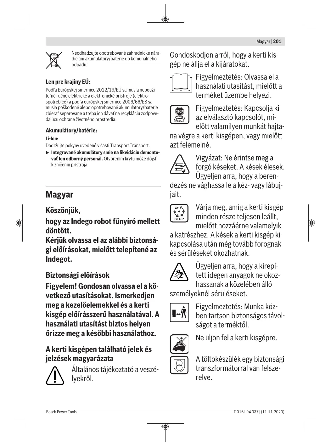 és minden més idegen térgyat. À gép hasznälata kôzben ügyeljen arra, hogy ne lehessenek nem läthat6 häziällatok, mäs éllatok vagy fatônkük a sürü gyep alatt. Sôtétedéskor vagy éjszaka kerül- je el a készülék hasznälatät, hogy csôk- kentse az ällatokkal valé talälkozäs kockäzatät.