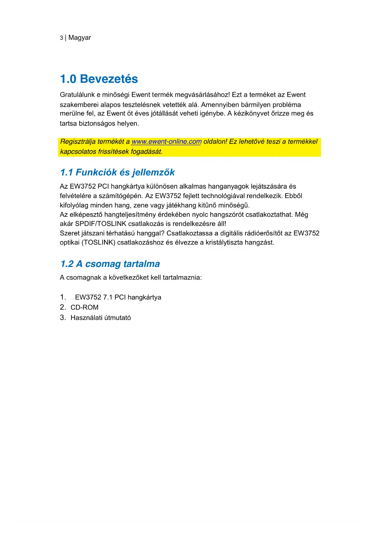Gratulálunk e minó ségi Ewent termék megvásárlásához! Ezt a terméket az Ewent szakemberei alapos tesztelésnek vetéték alá. Amennyiben bármilyen probléma merülne fel, az Ewent ötes jotállását veheti igénybe. A kézikönyvet őrize meg és tartsa biztonságos helyen.