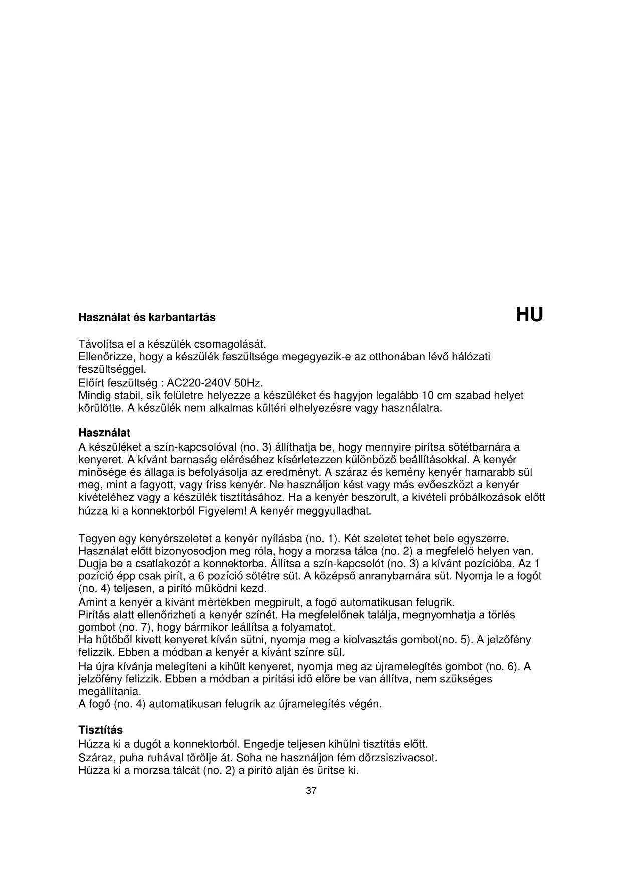 kivételéhez vagy a készülék tisztításához. Ha a kenyér beszorult, a kivételi próbálkozások előtt