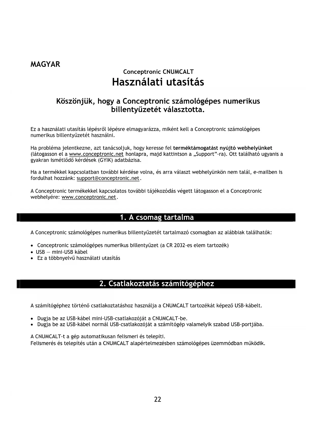 Ez a használati utasítás lépésről lépésre elmagyarázza, miként kell a Conceptronic számológépes numerikus billentyűzetét használni. Ha probléma jelentkezne, azt tanácsoljuk, hogy keresse fel terméktámogatást nyújtó webhelyünket (látogasson el a www.conceptronic.net honlapra, majd kattintson a „Support”-ra). Ott található ugyanis a gyakran ismétlődő kérdések (GYIK) adatbázisa. Ha a termékkel kapcsolatban további kérdése volna, és arra választ webhelyünkön nem talál, e-mailben is fordulhat hozzánk: support@conceptronic.net