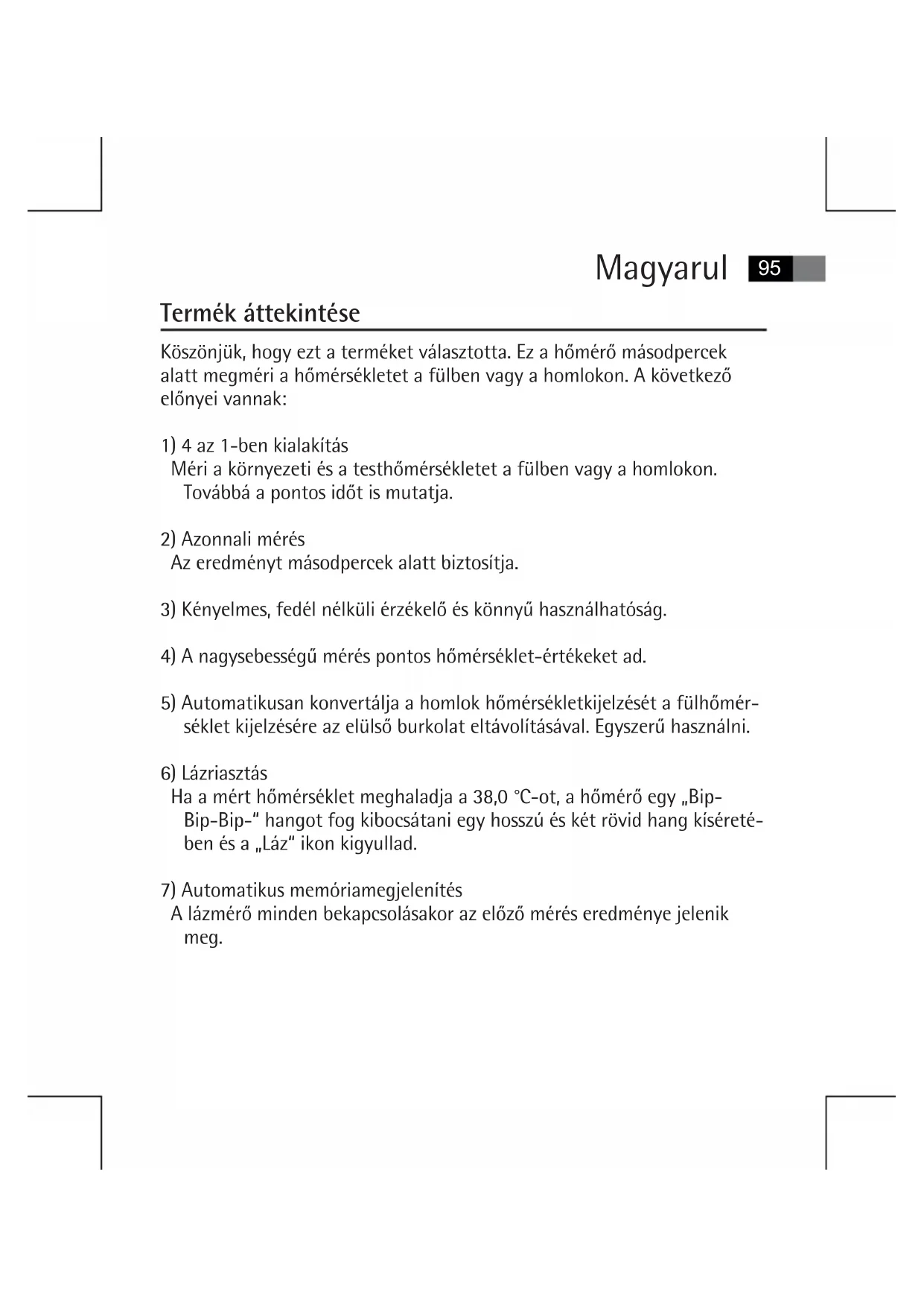 Ha a mért hőmérséklet meghaladja a 38,0 °C-ot, a hőmérő egy „Bip-