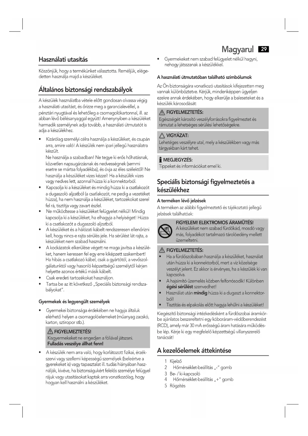 - Tisztításéselpakoláselőtthagyjalehűlniakészüléket! Kiegészítő biztonsági intézkedésként a fürdőszobai áramkör- be ajánlatos beszereltetni egy kóboráram-védőberendezést (RCD), amely már 30 mA erősségű áram hatására működés- be lép. Kérje ki egy megfelelő képzettségű villanyszerelő tanácsát! A kezelőelemek áttekintése 1 Kijelző 2 Hőmérséklet-beállítás„-“gomb 3 Be- / ki-kapcsoló 4 Hőmérséklet-beállítás„+“gomb 5 RögzítésMagyarul