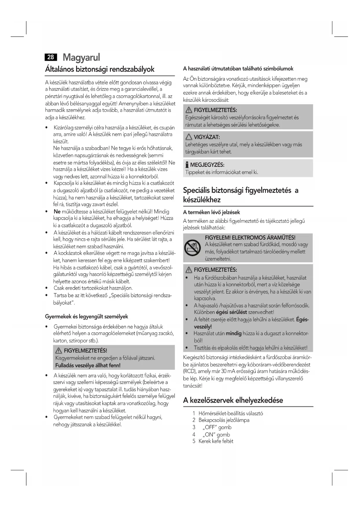 - Tisztításéselpakoláselőtthagyjalehűlniakészüléket! Kiegészítő biztonsági intézkedésként a fürdőszobai áramkör- be ajánlatos beszereltetni egy kóboráram-védőberendezést (RCD), amely már 30 mA erősségű áram hatására működés- be lép. Kérje ki egy megfelelő képzettségű villanyszerelő tanácsát! A kezelőszervek elhelyezkedése 1 Hőmérséklet-beállítás választó 2 Bekapcsolás jelzőlámpa 3 „OFF”gomb 4 „ON”gomb 5 Kerek kefe feltétMagyarul