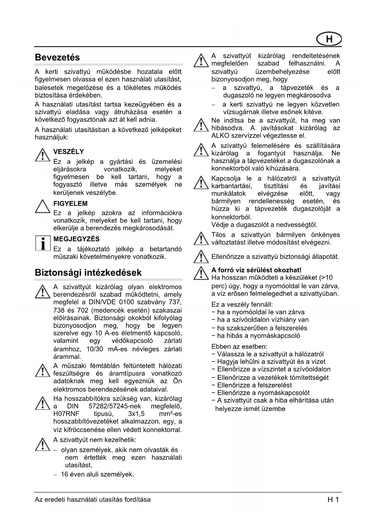 VESZÉLY Ez a jelkép a gyártási és üzemelési eljárásokra vonatkozik, melyeket figyelmesen be kell tartani, hogy a fogyasztó illetve más személyek ne kerüljenek veszélybe. FIGYELEM Ez a jelkép azokra az információkra vonatkozik, melyeket be kell tartani, hogy elkerülje a berendezés megkárosodását. MEGJEGYZÉS Ez a tájékoztató jelkép a betartandó műszaki követelményekre vonatkozik. Biztonsági intézkedések A szivattyút kizárólag olyan elektromos berendezésről szabad működtetni, amely megfelel a DIN/VDE 0100 szabvány 737, 738 és 702 (medencék esetén) szakaszai előírásainak. Biztonsági okokból kifolyólag bizonyosodjon meg, hogy be legyen szerelve egy 10 A-es életmentő kapcsoló, valamint egy védőkapcsoló zárlati áramhoz, 10/30 mA-es névleges zárlati árammal. A műszaki fémtáblán feltüntetett hálózati feszültségre és áramtípusra vonatkozó adatoknak meg kell egyezniük az Ön elektromos berendezésének adataival. Ha hosszabbítókra szükség van, kizárólag a DIN 57282/57245-nek megfelelő, H07RNF tipusú, 3x1,5 mm²-es hosszabbítóvezetéket alkalmazzon, egy, a víz kifröccsenése ellen védett konnektorral. A szivattyút nem kezelhetik: − olyan személyek, akik nem olvasták és nem értették meg ezen használati utasítást, − 16 éven aluli személyek. A szivattyút kizárólag rendeltetésének megfelelően szabad felhasználni. A szivattyú üzembehelyezése előtt bizonyosodjon meg, hogy − a szivattyú, a tápvezeték és a dugaszoló ne legyen megkárosodva − a kerti szivattyú ne legyen közvetlen vízsugárnak illetve esőnek kitéve. Ne indítsa be a szivattyút, ha meg van hibásodva. A javításokat kizárólag az ALKO szervízzel végeztesse el. A szivattyú felemelésére és szállítására kizárólag a fogantyút használja. Ne használja a tápvezetéket a dugaszolónak a konnektorból való kihúzására. Kapcsolja le a hálózatról a szivattyút karbantartási, tisztítási és javítási munkálatok elvégzése előtt, vagy bármilyen rendellenesség esetén, és húzza ki a tápvezeték dugaszolóját a konnektorból. Védje a dugaszolót a nedvességtől. Tilos a szivattyún bármilyen önkényes változtatást illetve módosítást elvégezni. Ellenőrizze a szivattyú biztonsági állapotát. A forró víz sérülést okozhat! Ha hosszan működteti a készüléket (>10 perc) úgy, hogy a nyomóoldal le van zárva, a víz erősen felmelegedhet a szivattyúban. Ez a veszély fennáll: − ha a nyomóoldal le van zárva − ha a szívóoldalon vízhiány van − ha szakszerűtlen a felszerelés − ha hibás a nyomáskapcsoló Ebben az esetben: − Válassza le a szivattyút a hálózatról − Hagyja lehűlni a szivattyút és a vizet − Ellenőrizze a vízszintet a szívóoldalon − Ellenőrizze a vezetékek tömítettségét − Ellenőrizze a felszerelést − Ellenőrizze a nyomáskapcsolót − A szivattyút csak a hiba elhárítása után helyezze ismét üzembe Az eredeti használati utasítás fordítása H 1Alkalmazás H 2 Az eredeti használati utasítás fordítása Alkalmazási területek: A szivattyú lakásban és kertben való magán felhasználásra van rendeltetve. A szivattyút kizárólag a műszaki adatoknak megfelelően az alkalmazási határok keretei közt használja. A szivattyú kizárólag a következő felhasználásokra alkalmas: − öntözés és locsolás (például nyilvános parkoké, virágágyaké és általában kerteké); − tartályok kiürítése vagy áttöltés (például medencéké); − kutak, esővizes hordók és vízgyűjtő medencék kiürítése A szivattyú kizárólag a következő folyadékok szivattyúzására alkalmas: − tiszta víz; − esővíz. − klórtartalmú víz (medencék vize). Tiltott alkalmazás A szivattyút nem szabad folyamatos üzemben használni. A szivattyú nem alkalmas a következő folyadékok szivattyúzására: − ivóvíz; − sós víz; − folyékony élelmiszerek; − szennyvíz; − maró hatású szerek és vegyszerek; − savas, gyúlékony, robbanó illetve illanó folyadékok; − 35˚C-nál melegebb folyadékok; − homokos víz, illetve csiszoló folyadékok. A szivattyú leírása Kerti szivattyú/tartozékok (A, B, C ábrák) 1 Szívócsonk/szívóvezeték csatlakozása 2 Töltőcsonk 3 Nyomócsonk/nyomóvezeték csatlakozása 4 Motorvédő borítás 5 Tápvezeték 6 ON/OFF kapcsoló 7 Szivattyúalap 8 Szivattyúhenger 9 Ürítő dugó Szivattyútér 10 Leeresztő csavar – Szivattyútér 11 Kémlelőfedél – Szűrő 12 Tömítések a szűrőhöz 13 Szűrő 14 Visszacsapószelep 15 Tömítés 16 O-gyűrű (Kémlelőfedél – Szűrő) 17 Síktömítés 18 Könyök 19 Síktömítés 20 Csatlakozó csonk 21 Ó-gyűrű 22 Nyomóvezeték (Tartozék) 23 Szívókészlet (Tartozék) Szűrőkulcs (B ábra)