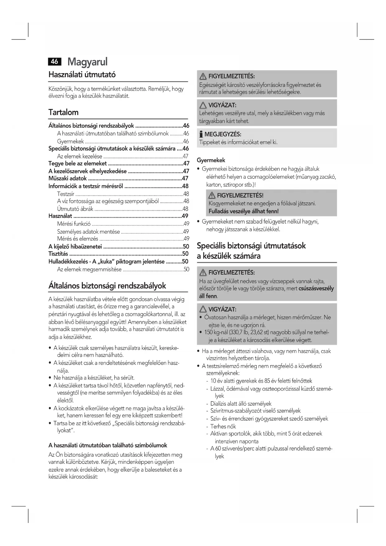 - Használati útmutató Köszönjük, hogy a termékünket választotta. Reméljük, hogy élvezni fogja a készülék használatát. Tartalom Általános biztonsági rendszabályok p. 46