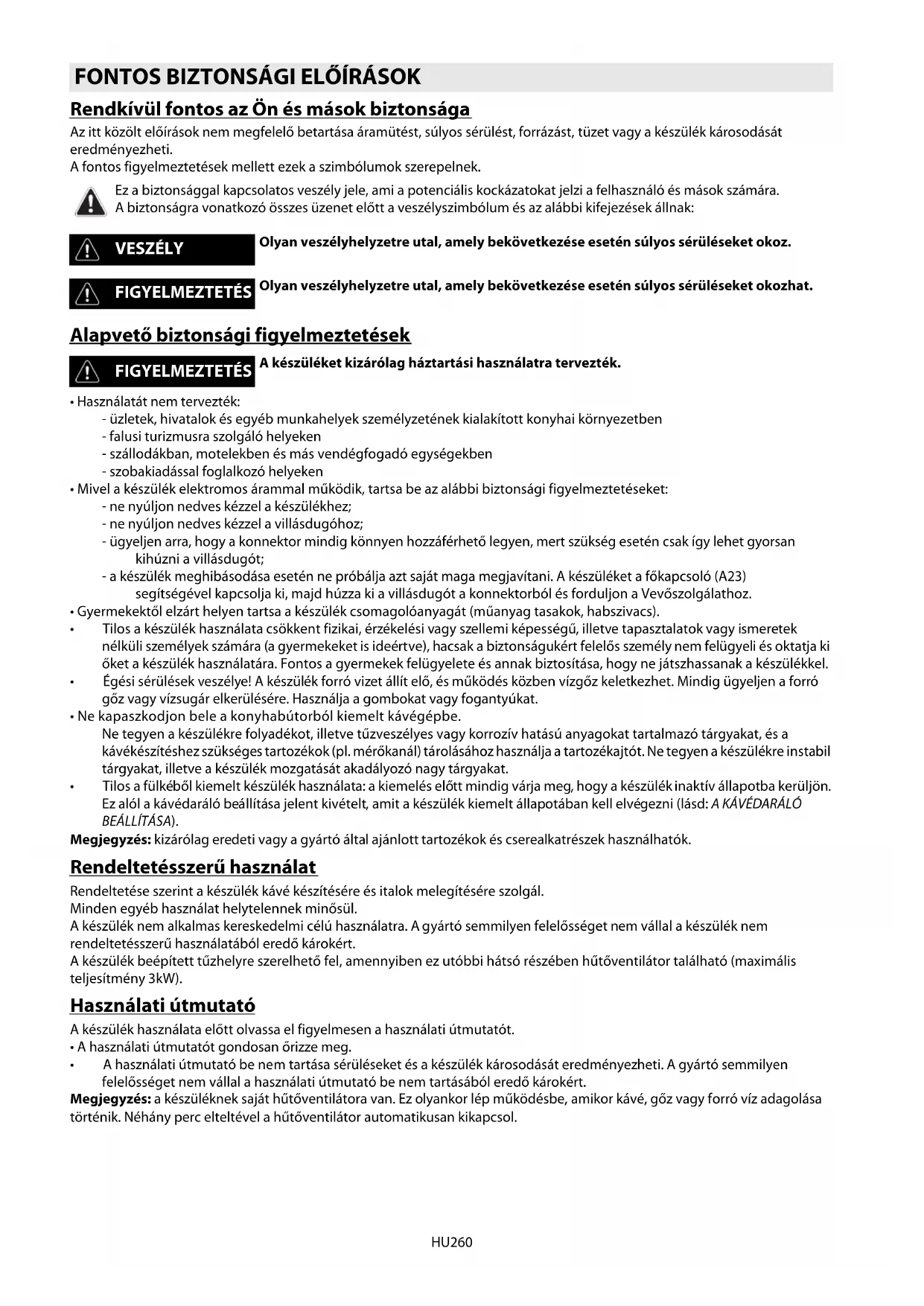 - Tilos a fülkéből kiemelt készülék használata: a kiemelés előtt mindig várja meg, hogy a készülék inaktív állapotba kerüljön. Ez alól a kávédaráló beállítása jelent kivételt, amit a készülék kiemelt állapotában kell elvégezni (lásd: A KÁVÉDARÁLÓ BEÁLLÍTÁSA). Megjegyzés: kizárólag eredeti vagy a gyártó által ajánlott tartozékok és cserealkatrészek használhatók. Rendeltetésszerű használat Rendeltetése szerint a készülék kávé készítésére és italok melegítésére szolgál. Minden egyéb használat helytelennek minősül. A készülék nem alkalmas kereskedelmi célú használatra. A gyártó semmilyen felelősséget nem vállal a készülék nem rendeltetésszerű használatából eredő károkért. A készülék beépített tűzhelyre szerelhető fel, amennyiben ez utóbbi hátsó részében hűtőventilátor található (maximális teljesítmény 3kW). Használati útmutató A készülék használata előtt olvassa el figyelmesen a használati útmutatót.