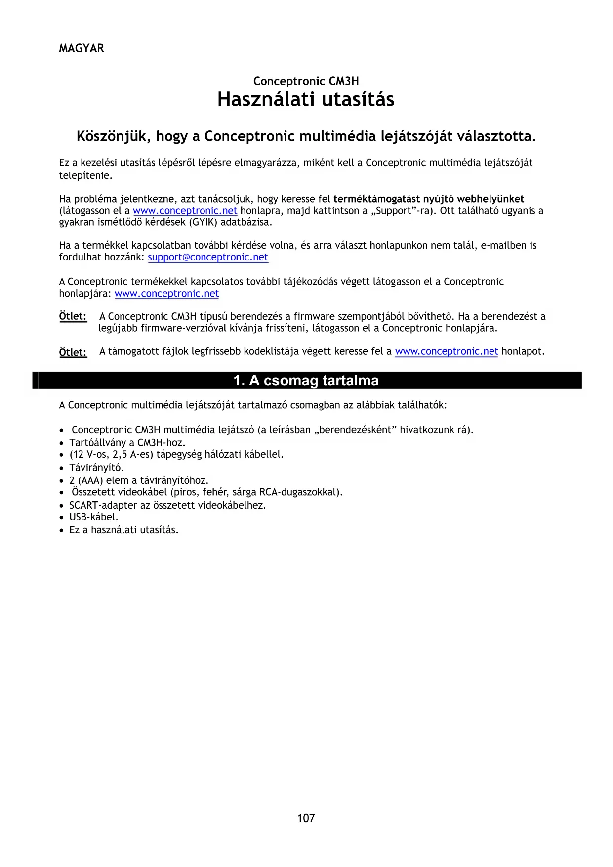 • Conceptronic CM3H multimédia lejátszó (a leírásban „berendezésként” hivatkozunk rá).