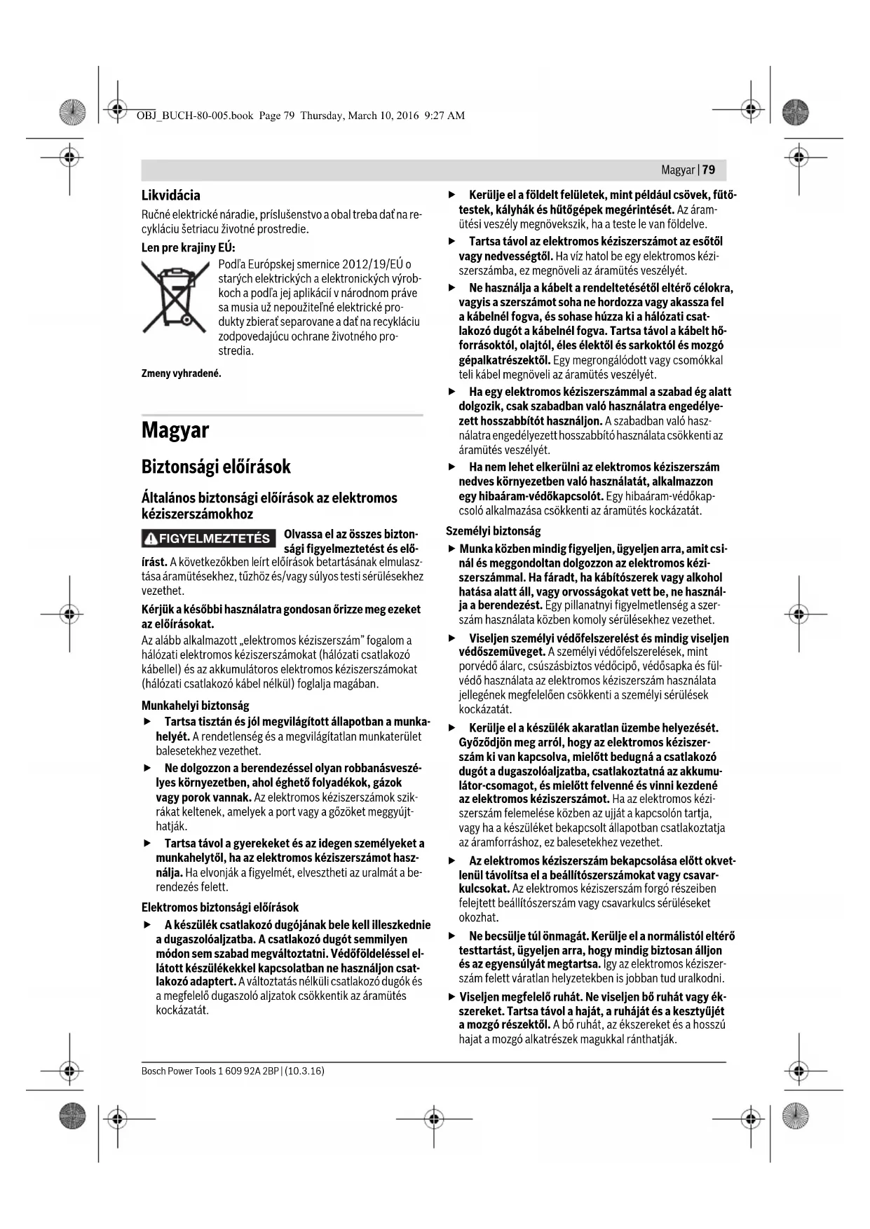 Ak chcete ručné elektrické náradie vypnúť uvoľnite vypínač 2 a v takom prípade, ak je zaaretovaný aretačným tlačidlom 3, stlačte vypínač 2 na okamih a potom ho znova uvoľnite. Aby ste ušetrili energiu, zapínajte ručné elektrické náradie iba vtedy, ked ho používate. Predvoľba frekvencie vibrácií Pomocou nastavovacieho kolieska predvoľby frekvencie vib- rácií 1 môžete nastaviť požadovanú frekvenciu vibrácií aj po- čas prevádzky ručného elektrického náradia. Potrebná hodnota frekvencie vibrácií závisí od materiálu a pracovných podmienok a dá sa zistiť praktickou skúškou. Pokyny na používanie Počkajte na úplné zastavenie ručného elektrického ná- radia, až potom ho odložte. Pred každou prácou na ručnom elektrickom náradí vy- tiahnite zástrčku náradia zo zásuvky. Úber je pri brúsení do značnej miery závislý od výberu vhod- ného brúsneho listu ako aj od nastavenej frekvencie vibrácií. Dobrý brúsny výkon a šetrenie ručného elektrického náradia môžete dosiahnuť len pomocou bezchybných brúsnych lis- tov. Dbajte na rovnomerný prítlak, aby ste zvýšili životnosť brús- nych listov. Nadmierne zvýšenie prítlaku nemá za následok zvýšenie brús- neho výkonu, vedie len k zvýšenému opotrebovaniu ručného elektrického náradia a brúsneho listu. Brúsny list, ktorý ste použili na brúsenie kovového materiálu, už nepoužívajte na brúsenie iných materiálov. Používajte na brúsenie len originálne príslušenstvo Bosch. Údržba a servis Údržba a čistenie Pred každou prácou na ručnom elektrickom náradí vy- tiahnite zástrčku náradia zo zásuvky. Ručné elektrické náradie a jeho vetracie štrbiny udržia- vajte vždy v čistote, aby ste mohli pracovať kvalitne a bezpečne. Ak je potrebná výmena prívodnej šnúry, musí ju vykonať firma Bosch alebo niektoré autorizované servisné stredisko ručné- ho elektrického náradia Bosch, aby sa zabránilo ohrozeniu bezpečnosti používateľa náradia. Servisné stredisko a poradenstvo pri používaní Pri všetkých dopytoch a objednávkach náhradných súčiastok uvádzajte bezpodmienečne 10-miestne vecné číslo uvedené na typovom štítku výrobku. Servisné stredisko Vám odpovie na otázky týkajúce sa opravy a údržby Vášho produktu ako aj náhradných súčiastok. Rozlo- žené obrázky a informácie k náhradným súčiastkam nájdete aj na web-stránke: www.bosch-pt.com Tím poradcov Bosch Vám s radosťou poskytne pomoc pri otázkach týkajúcich sa našich produktov a ich príslušenstva. Slovakia Na www.bosch-pt.sk si môžete objednať opravu vášho stroja alebo náhradné diely online. Tel.: (02) 48 703 800 Fax: (02) 48 703 801 E-Mail: servis.naradia@sk.bosch.com www.bosch.sk Zrnitosť Na obrábanie všetkých dreve- ných materiálov 40—240 Na predbrúsenie napr. drsných nehobľovaných hranolov a do- sák hrubý 40, 60 Na rovinné brúsenie a na zarov- návanie drobných nerovností stredný 80, 100, 120 Na dokončovacie a jemné brúse- nie tvrdého dreva jemný 180, 240 Na obrábanie farebných a la- kovaných povrchov resp. zák- ladných úprav napríklad plni- vami alebo tmelom 40—320 Na obrúsenie farby hrubý 40, 60 Na brúsenie základnej farby stredný 80, 100, 120 Na dokončovacie brúsenie pri la- kovaní jemný 180, 240, 320 OBJ_BUCH-80-005.book Page 78 Thursday, March 10, 2016 9:27 AMMagyar | 79 Bosch Power Tools 1 609 92A 2BP | (10.3.16) Likvidácia Ručné elektrické náradie, príslušenstvo a obal treba dať na re- cykláciu šetriacu životné prostredie. Len pre krajiny EÚ: Podľa Európskej smernice 2012/19/EÚ o starých elektrických a elektronických výrob- koch a podľa jej aplikácií v národnom práve sa musia už nepoužiteľné elektrické pro- dukty zbierať separovane a dať na recykláciu zodpovedajúcu ochrane životného pro- stredia. Zmeny vyhradené. Magyar Biztonsági előírások Általános biztonsági előírások az elektromos kéziszerszámokhoz Olvassa el az összes bizton- sági figyelmeztetést és elő- írást. A következőkben leírt előírások betartásának elmulasz- tása áramütésekhez, tűzhöz és/vagy súlyos testi sérülésekhez vezethet. Kérjük a későbbi használatra gondosan őrizze meg ezeket az előírásokat. Az alább alkalmazott „elektromos kéziszerszám” fogalom a hálózati elektromos kéziszerszámokat (hálózati csatlakozó kábellel) és az akkumulátoros elektromos kéziszerszámokat (hálózati csatlakozó kábel nélkül) foglalja magában. Munkahelyi biztonság Tartsa tisztán és jól megvilágított állapotban a munka- helyét. A rendetlenség és a megvilágítatlan munkaterület balesetekhez vezethet. Ne dolgozzon a berendezéssel olyan robbanásveszé- lyes környezetben, ahol éghető folyadékok, gázok vagy porok vannak. Az elektromos kéziszerszámok szik- rákat keltenek, amelyek a port vagy a gőzöket meggyújt- hatják. Tartsa távol a gyerekeket és az idegen személyeket a munkahelytől, ha az elektromos kéziszerszámot hasz- nálja. Ha elvonják a figyelmét, elvesztheti az uralmát a be- rendezés felett. Elektromos biztonsági előírások A készülék csatlakozó dugójának bele kell illeszkednie a dugaszolóaljzatba. A csatlakozó dugót semmilyen módon sem szabad megváltoztatni. Védőföldeléssel el- látott készülékekkel kapcsolatban ne használjon csat- lakozó adaptert. A változtatás nélküli csatlakozó dugók és a megfelelő dugaszoló aljzatok csökkentik az áramütés kockázatát. Kerülje el a földelt felületek, mint például csövek, fűtő- testek, kályhák és hűtőgépek megérintését. Az áram- ütési veszély megnövekszik, ha a teste le van földelve. Tartsa távol az elektromos kéziszerszámot az esőtől vagy nedvességtől. Ha víz hatol be egy elektromos kézi- szerszámba, ez megnöveli az áramütés veszélyét. Ne használja a kábel