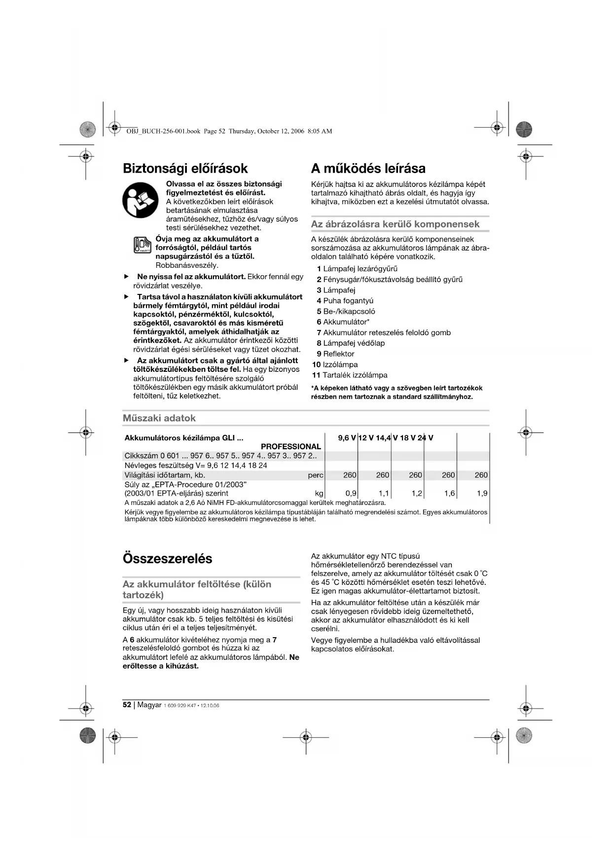 - Tegye be a 8 védőlapot az 1 lezárógyűrűbe és csavarja rá a lezárógyűrűt a 3 lámpafejre. Ügyeljenek az előírásszerű illeszkedésre. Üzemeltetés Üzembe helyezés Az akkumulátor beszerelése f Csak eredeti Bosch O-Pack-akkumulátorokat használjon, amelyek feszültsége megegyezik az akkumulátoros kézilámpa típustábláján megadott feszültséggel. Más akkumulátorok használata személyi sérüléseket és tüzet okozhat. Tegye be a 6 akkumulátort a fogantyúba, amíg az érezhetően bepattan a helyére és egy síkba kerül a fogantyúval. Be- és kikapcsolás Az akkumulátoros kézilámpa üzembe helyezéséhez tolja el felfelé az 5 be-/kikapcsolót. Az akkumulátoros kézilámpa kikapcsolásához tolja el lefelé az 5 be-/kikapcsolót. A reflektor helyzetének megváltoztatása A 3 lámpafejet az óramutató járásával ellenkező irányú, legfeljebb 90°-os elforgatásával felfelé lehet állítani. A fénysugár/fókusztávolság megváltoztatása A 2 beállító gyűrű forgatásával a fénysugár alakját, illetve a reflektor fókusztávolságát meg lehet változtatni. Munkavégzési tanácsok Alacsony hőmérsékleteken a fényerősség gyengébb és a világítási időtartam rövidebb lehet. A Bosch NiMH-akkumulátorok alkalmazása esetén – 10 °C alatti hőmérsékleteken a teljesítmény korlátozott. Puha fogantyú A 4 fogantyú felület (puha fogantyú) biztonságot nyújt a kéz lecsúszása ellen és könnyebben kezelhetővé teszi az akkumulátoros kézilámpát. OBJ_BUCH-256-001.book Page 53 Thursday, October 12, 2006 8:05 AM54 | Magyar 1 609 929 K47 • 12.10.06 Karbantartás és szerviz Karbantartás és tisztítás Ha az akkumulátoros kézilámpa a gondos gyártási és ellenőrzési eljárás ellenére egyszer mégis meghibásodna, akkor a javítással csak Bosch elektromos kéziszerszám-műhely ügyfélszolgálatát szabad megbízni. Ha kérdései vannak, vagy pótalkatrészeket akar megrendelni, okvetlenül adja meg az akkumulátoros kézilámpa típustábláján található 10-jegyű megrendelési számot. Szerviz- és Vevőszolgálat A tartalékalkatrészekkel kapcsolatos robbantott ábrák és egyéb információ a következő címen található: www.bosch-pt.com Robert Bosch Kft 1103 Budapest Gyömröi út. 120 ✆ . . . . . . . . . . . . . . . . . . . . . . +36 (0)1 / 4 31 38 35 Fax . . . . . . . . . . . . . . . . . . . . . +36 (0)1 / 4 31 38 88 Eltávolítás Az akkumulátoros lámpákat, a tartozékokat és a csomagolást a környezetvédelmi szempontoknak megfelelően kell újrafelhasználásra előkészíteni. Csak az EU-tagországok számára: Ne dobja ki az akkumulátoros lámpákat a háztartási szemétbe! A használt villamos és elektronikus berendezésekre vonatkozó 2002/96/EG sz. Európai Irányelvnek és ennek a megfelelő országok jogharmonizációja révén hozott törvényeknek megfelelően a már használhatatlan akkumulátoros kézilámpákat külön össze kell gyűjteni és a környezetvédelmi szempontból megfelelő újra felhasználásra le kell adni. Akkumulátorok/elemek: Ni-Cd: Nikkel-kadmium Figyelem: Ezek az akkumulátorok kadmiumot tartalmaznak, ez egy igen mérgező hatású nehézfém. Ni-MH: Nikkel-metálhidrid Sohase dobja ki az akkumulátorokat/elemeket a háztartási szemétbe, tűzbe, vagy vízbe. Az akku- mulátorokat/elemeket össze kell gyűjteni, újra fel kell használni, vagy a környezetvédelmi előírásoknak megfelelően kell azokat a hulladékba eltávolítani. Csak az EU-tagországok számára: A 91/157/EGK irányelv értelmében a meghibásodott vagy elhasznált akkumulátorokat/elemeket újrafelhasználásra kell leadni. A változtatások joga fenntartva. OBJ_BUCH-256-001.book Page 54 Thursday, October 12, 2006 8:05 AMРусский | 551 609 929 K47 • 12.10.06 Указания по безопасности Прочтите все указания и инструк- ции по технике безопасности. Упу- щения, допущенные при соблюдении указаний и инструкций по технике безопасности, могут стать причиной электрического поражения, пожара и тяжелых травм. Защищайте аккумулятор от воздействия высоких температур, например, от продолжительной солнечной радиации и огня. Опасность взрыва. f Не открывайте аккумулятор. При этом возникает опасность короткого замыкания. f Защищайте неиспользуемый аккумулятор от канцелярских скрепок, монет, ключей, гвоздей, винтов и других маленьких металлических предметов, которые могут закоротить полюса. Короткое замыкание полюсов аккумулятора может привести к ожогам или пожару. f Заряжайте аккумуляторы только в зарядных устройствах, рекомендуемых изготовителем. Зарядное устройство, предусмотренное для определенного вида аккумуляторов, может привести к пожарной опасности при использовании его с другими аккумуляторами. Описание функции Пожалуйста, откройте раскладную страницу с иллюстрациями аккумуляторного фонаря и оставляйте ее открытой пока Вы изучаете руководство по эксплуатации. Изображенные составные части Нумерация изобр