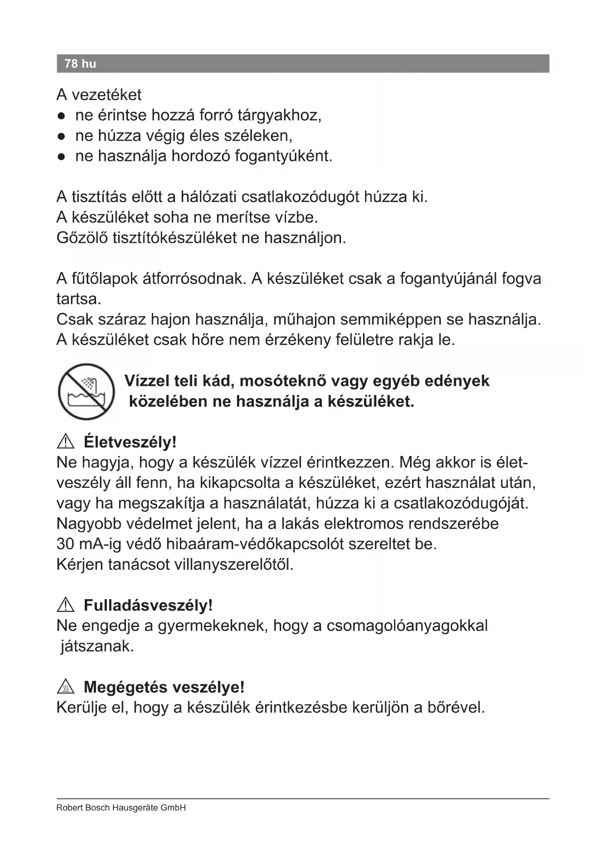 Robert Bosch Hausgeräte GmbH 78 hu A vezetéket ● ne érintse hozzá forró tárgyakhoz, ● ne húzza végig éles széleken, ● ne használja hordozó fogantyúként. A tisztítás előtt a hálózati csatlakozódugót húzza ki. A készüléket soha ne merítse vízbe. Gőzölő tisztítókészüléket ne használjon. A fűtőlapok átforrósodnak. A készüléket csak a fogantyújánál fogva tartsa. Csak száraz hajon használja, műhajon semmiképpen se használja. A készüléket csak hőre nem érzékeny felületre rakja le. Vízzel teli kád, mosóteknő vagy egyéb edények közelében ne használja a készüléket.