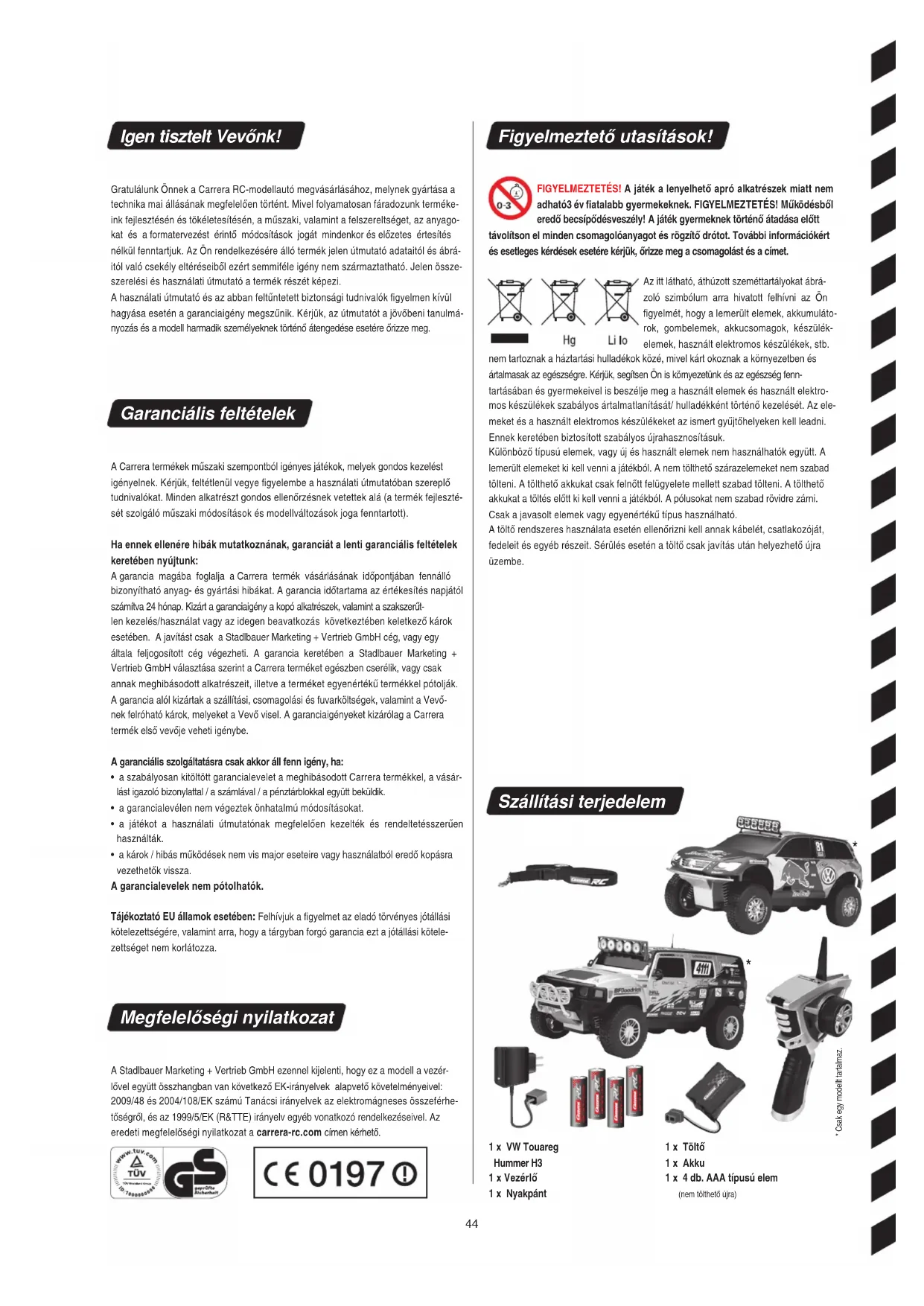 - a károk / hibás működések nem vis major eseteire vagy használatból eredő kopásra vezethetők vissza. A garancialevelek nem pótolhatók. Tájékoztató EU államok esetében: Felhívjuk a figyelmet az eladó törvényes jótállási kötelezettségére, valamint arra, hogy a tárgyban forgó garancia ezt a jótállási kötele- zettséget nem korlátozza. Megfelelőségi nyilatkozat A Stadlbauer Marketing + Vertrieb GmbH ezennel kijelenti, hogy ez a modell a vezér- lővel együtt összhangban van következő EK-irányelvek alapvető követelményeivel: 2009/48 és 2004/108/EK számú Tanácsi irányelvek az elektromágneses összeférhe- tőségről, és az 1999/5/EK (R&TTE) irányelv egyéb vonatkozó rendelkezéseivel. Az eredeti megfelelőségi nyilatkozat a carrera-rc.com címen kérhető. Figyelmeztető utasítások! FIGYELMEZTETÉS! A játék a lenyelhető apró alkatrészek miatt nem adható3 év fiatalabb gyermekeknek. FIGYELMEZTETÉS! Működésből eredő becsípődésveszély! A játék gyermeknek történő átadása előtt távolítson el minden csomagolóanyagot és rögzítő drótot. További információkért és esetleges kérdések esetére kérjük, őrizze meg a csomagolást és a címet. Az itt látható, áthúzott szeméttartályokat ábrá- zoló szimbólum arra hivatott felhívni az Ön figyelmét, hogy a lemerült elemek, akkumuláto- rok, gombelemek, akkucsomagok, készülék- elemek, használt elektromos készülékek, stb. nem tartoznak a háztartási hulladékok közé, mivel kárt okoznak a környezetben és ártalmasak az egészségre. Kérjük, segítsen Ön is környezetünk és az egészség fenn- tartásában és gyermekeivel is beszélje meg a használt elemek és használt elektro- mos készülékek szabályos ártalmatlanítását/ hulladékként történő kezelését. Az ele- meket és a használt elektromos készülékeket az ismert gyűjtőhelyeken kell leadni. Ennek keretében biztosított szabályos újrahasznosításuk. Különböző típusú elemek, vagy új és használt elemek nem használhatók együtt. A lemerült elemeket ki kell venni a játékból. A nem tölthető szárazelemeket nem szabad tölteni. A tölthető akkukat csak felnőtt felügyelete mellett szabad tölteni. A tölthető akkukat a töltés előtt ki kell venni a játékból. A pólusokat nem szabad rövidre zárni. Csak a javasolt elemek vagy egyenértékű típus használható. A töltő rendszeres használata esetén ellenőrizni kell annak kábelét, csatlakozóját, fedeleit és egyéb részeit. Sérülés esetén a töltő csak javítás után helyezhető újra üzembe. Szállítási terjedelem 1 x VW Touareg Hummer H3 1 x Vezérlő 1 x Nyakpánt 1 x Töltő 1 x Akku 1 x 4 db. AAA típusú elem (nem tölthető újra)1